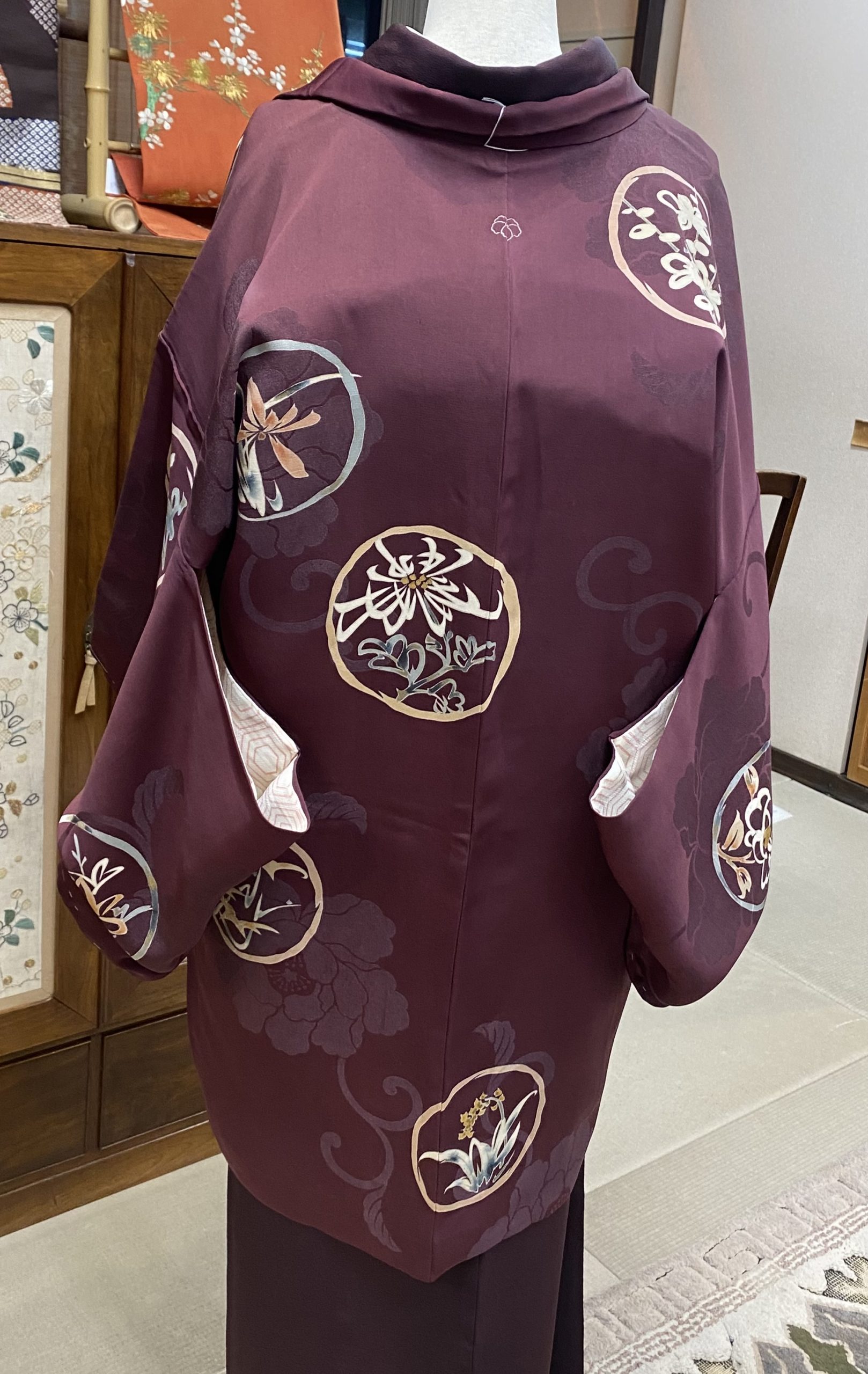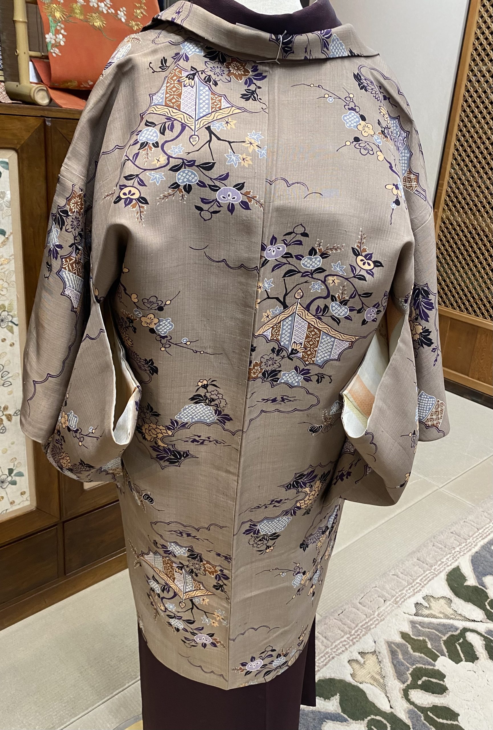 落ち着いた色合いながら、よく見るととても華やかな羽織。マットな質感でおしゃれ上級者の雰囲気です。