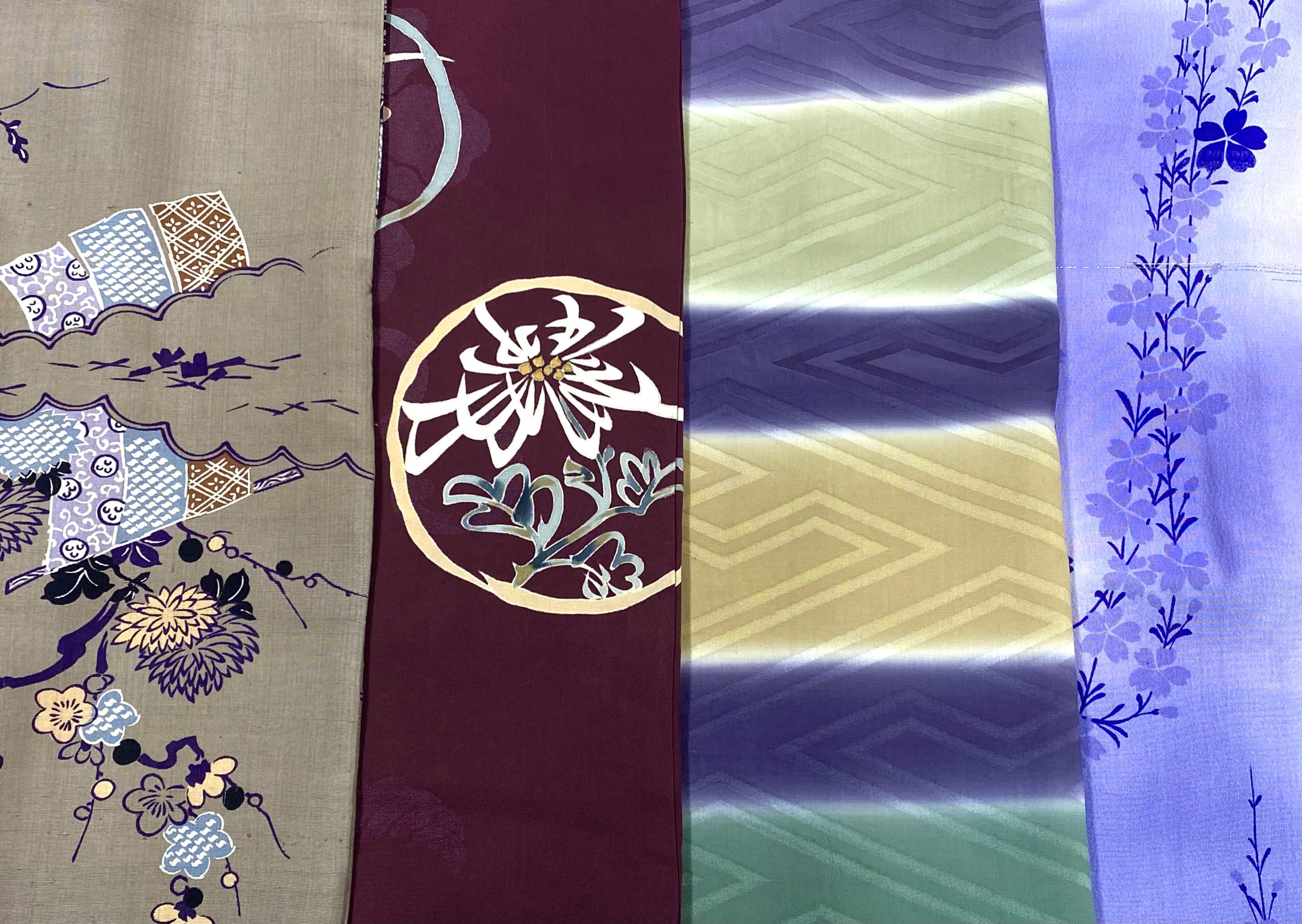 最後は、艶やかな桜。紫から白へのグラデーションの中に、しなやかに枝垂れる桜が描かれています。ところどころに入った銀通しが、日差しに煌めく雲のようですね。