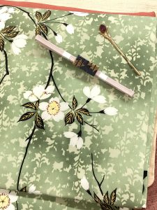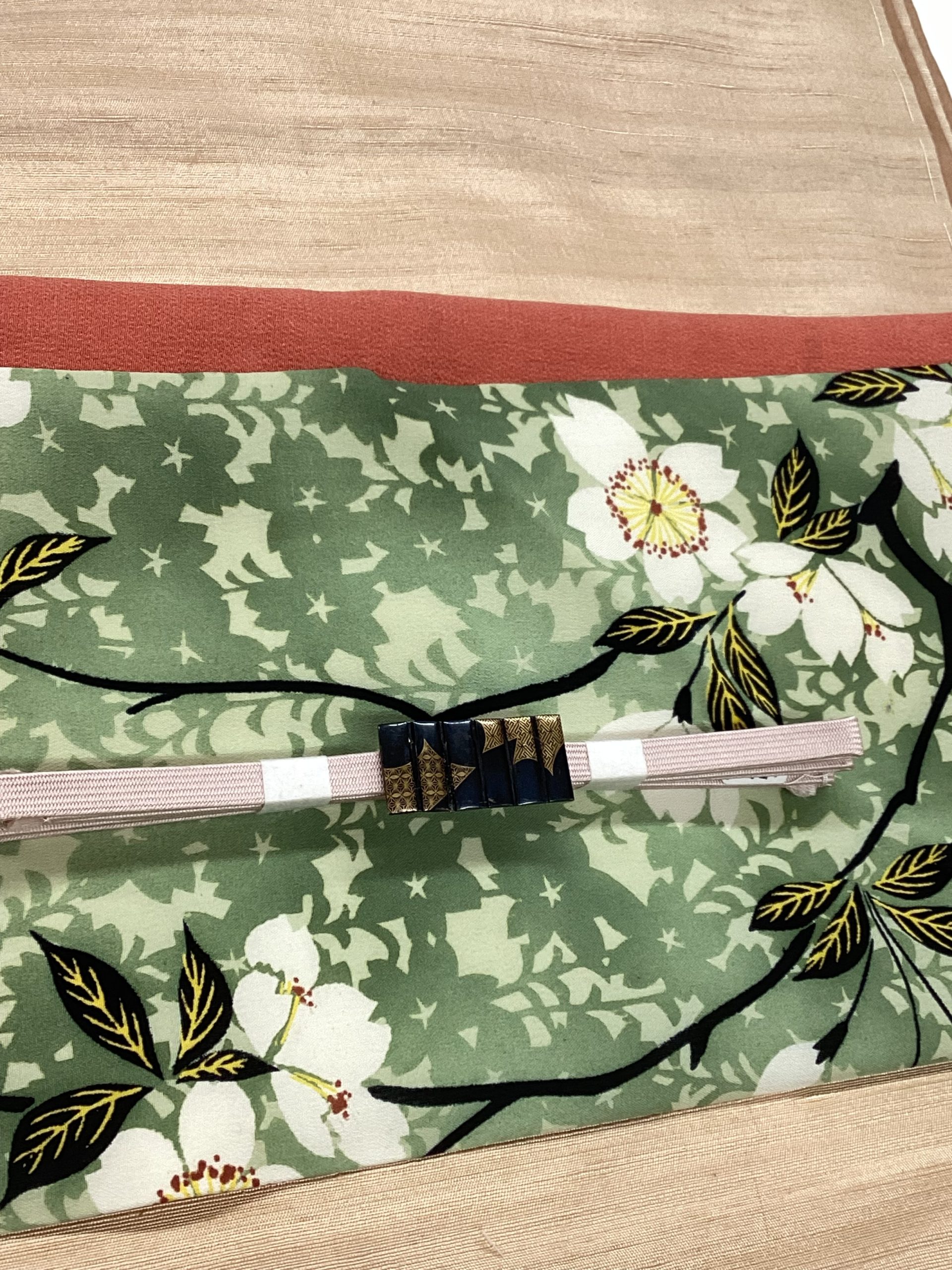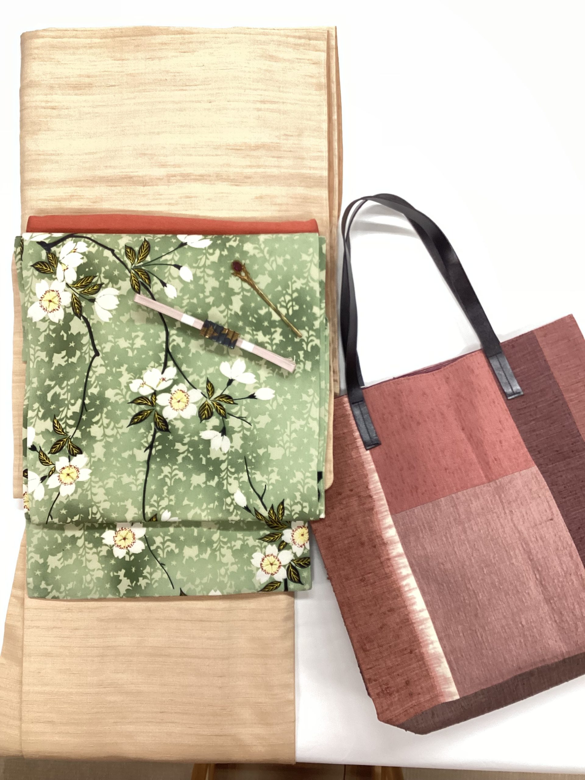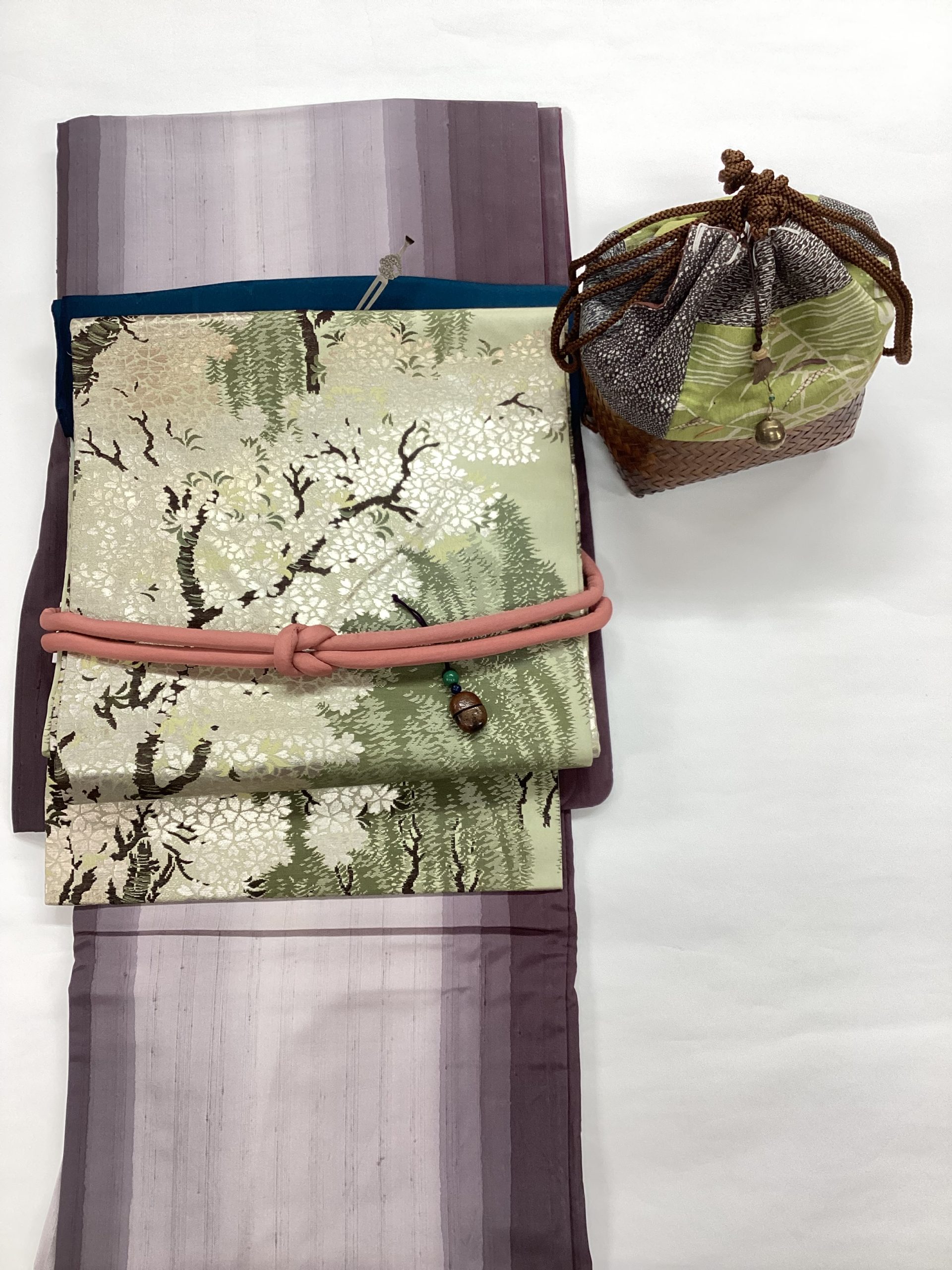 最初のコーディネートに比べて、同じ緑系の桜柄の帯でも、素材の質感や柄行きで違った雰囲気を楽しめますね。 こちらはよりカジュアルな普段着として活躍してくれそうです。