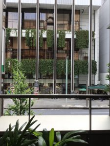 雨にぬれた緑が、ほっとしているような銀座店の窓辺です。
