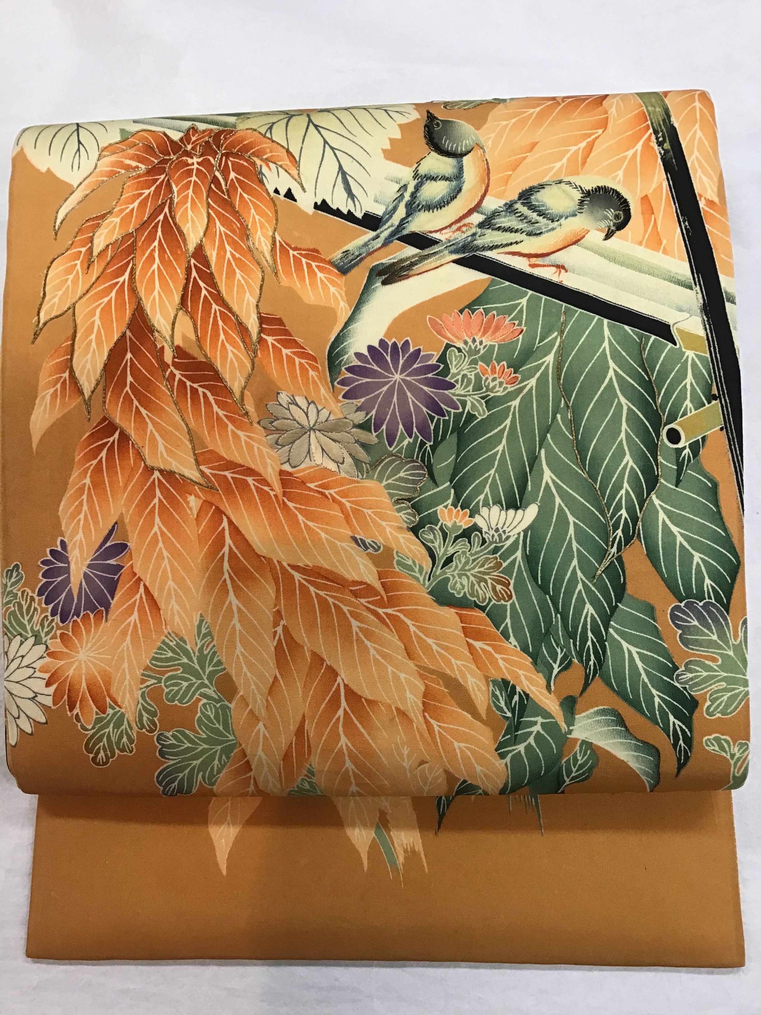 鳥と草花の染めに金駒刺繍の帯