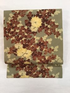 抑えた色調に大人可愛い菊が咲きほこる秋にぴったりの帯、締めやすい全通柄です。