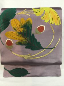 珍しい紫色の朱子織にどんぐり、銀杏、松葉などが大胆にデザイン化された個性が光る帯。