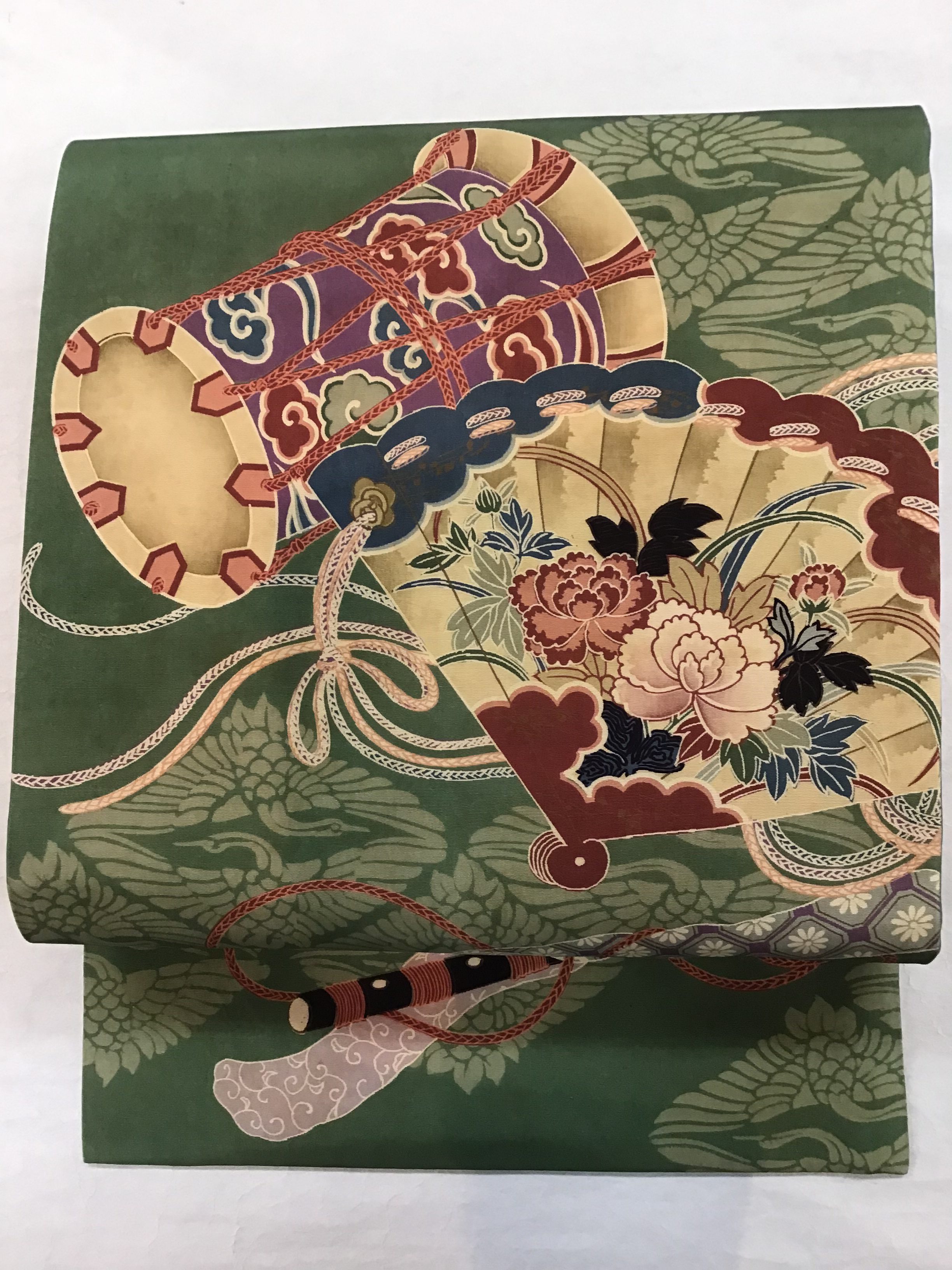 グリーン地に鼓、笛、笙などの楽器や扇が優雅に描かれた帯。