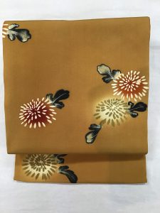 赤や金で菊の花が描かれた黄朽葉色の地色が上品で合わせやすい帯。
