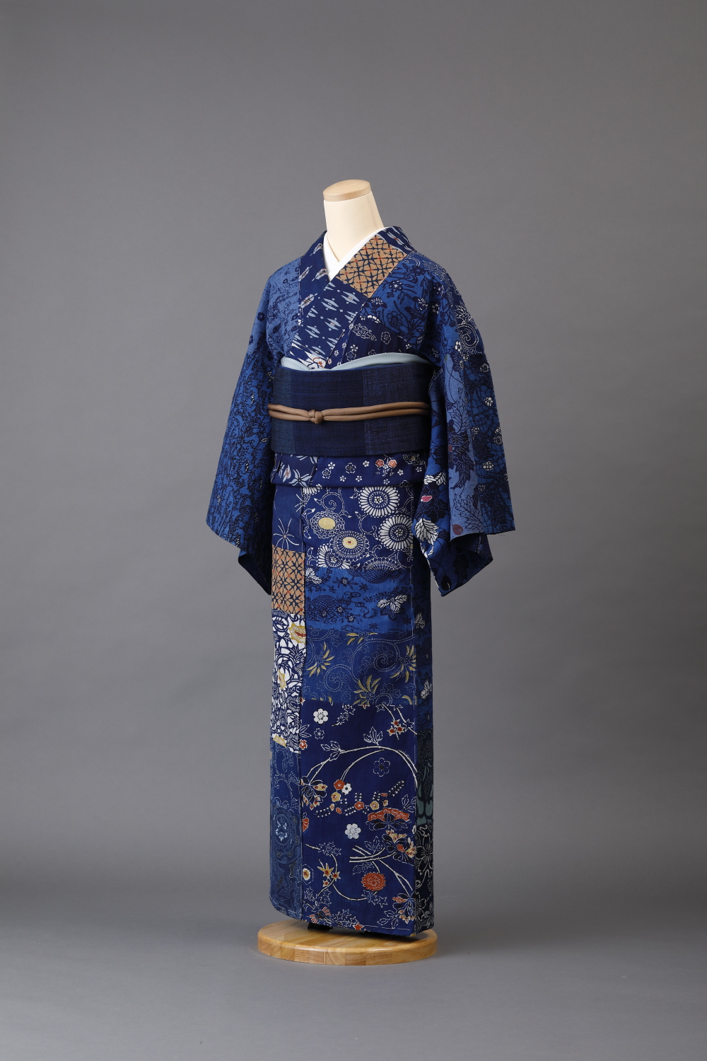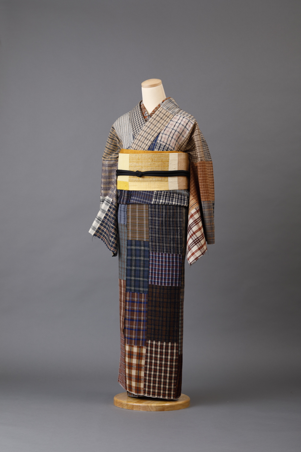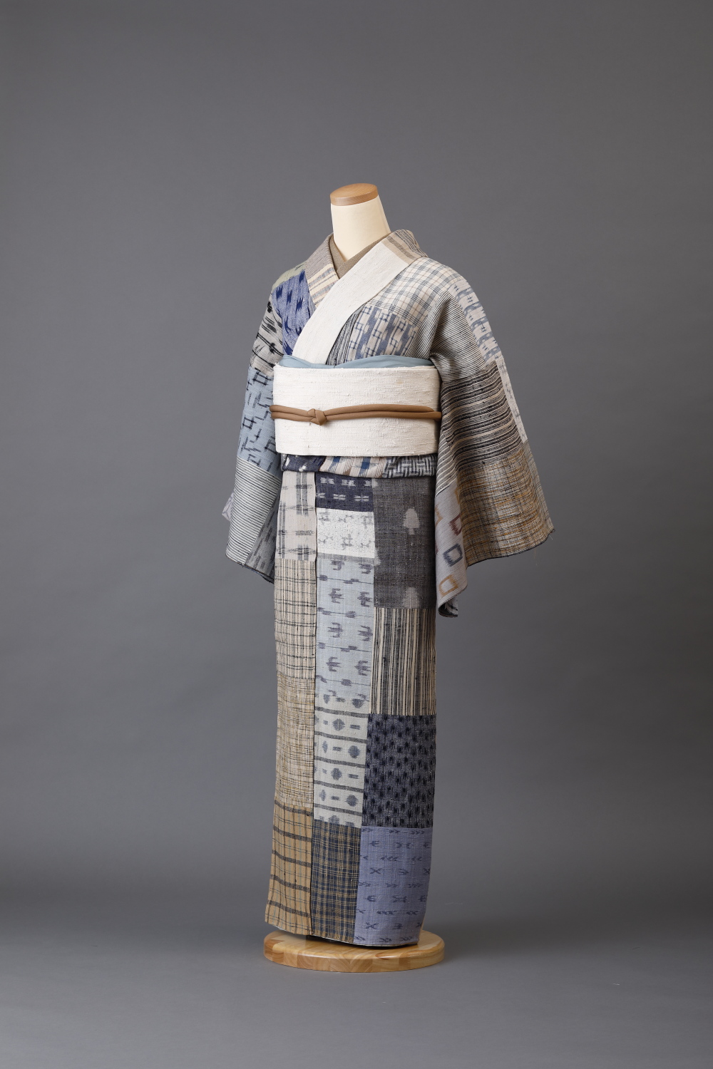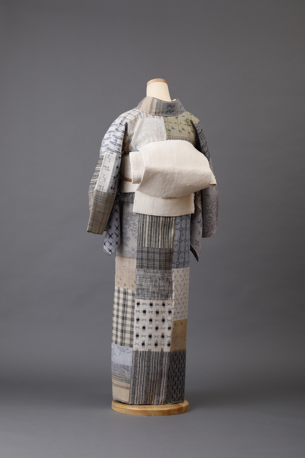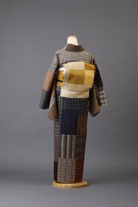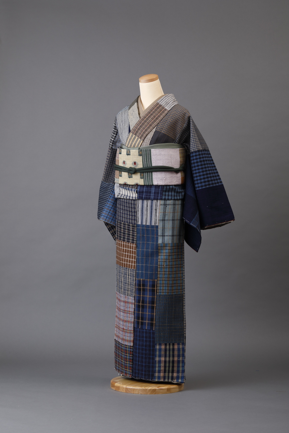 その1 継ぎ着物 浦野さんの裂を継いで着物に仕立て、帯や小物でコーディングしています。