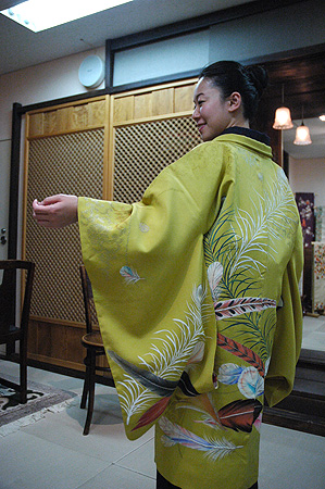 地紋様のある鶸色(鶸の羽を連想させる色)に様々な羽が手で描かれ、刺繍もほどこされている、とても珍しい羽織です!