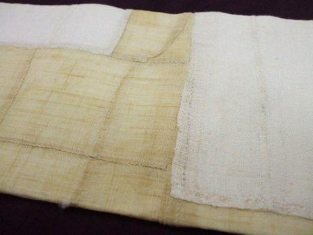 麻ならではの透明感ある素材を使い、小さなピースを縫いつなぎ四角い1枚に創り上げる色彩の魅力と縫い目の細いラインの直線の面白さが新鮮です。