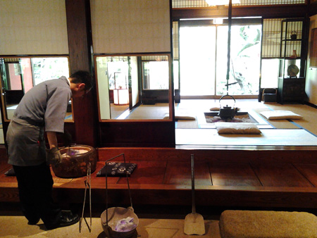 和室にある囲炉裏の炭は、寒い時期ではないにもかかわらず、朝のうちに火をおこしてました。