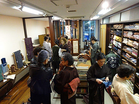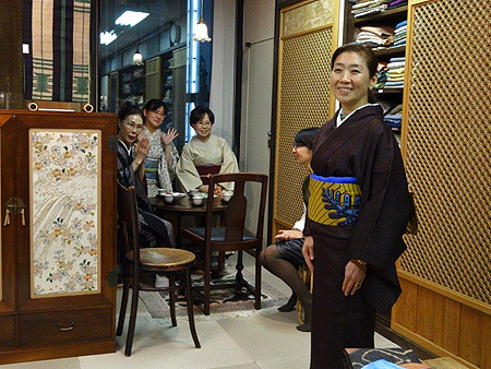 赤い縞の結城にコートジボワールのモダンプリントで仕立てた帯をした着姿に他のお客様から、「プリミティブアートを身に纏っているみた~い」と思わず歓声が上がり、アフリカからの風は、新しい着物の風になってお客様にも楽しんでいただけたようです。
