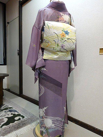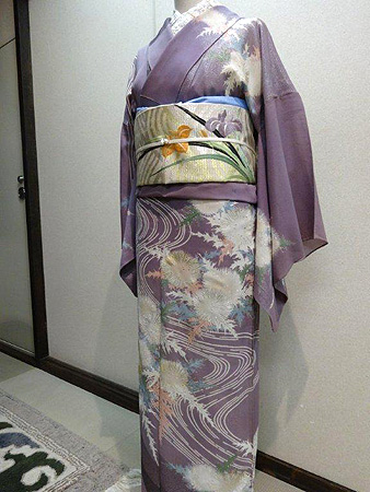流水にあざみ漆銀訪問着に青海波地紋様菖蒲・桔梗名古屋帯青海波地紋様菖蒲・桔梗名古屋帯金、銀、漆糸がおしげもなく織り込まれた、地色の美しい品格と華やかさを持つあざみの訪問着です。
