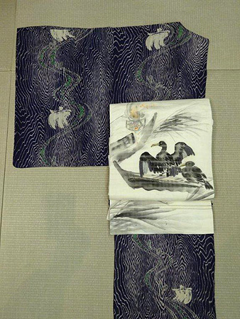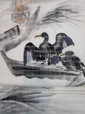 羽を広げた鵜が夕闇に映える様子を描いた絽の名古屋帯。