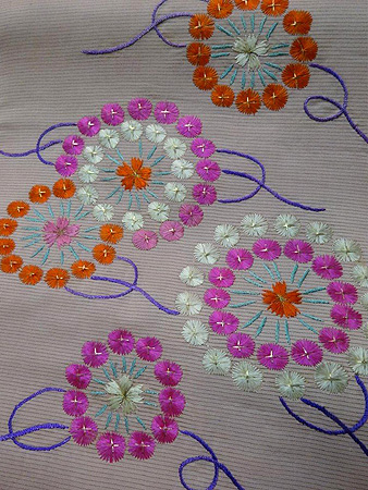 デコ文様絽小紋になでしこ刺繍名古屋帯なでしこ刺繍名古屋帯白にピンク、青紫の小花の更紗柄がかわいい絽小紋にはピンクのなでしこの花車の刺繍帯を配してみました。