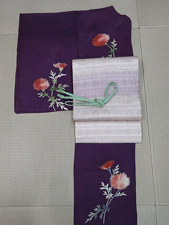 あざみの花がゆったりと描かれた葡萄染色に心奪われる素敵な訪問着に、優しい紫とピンクのぼかしと浮織りの袋帯を合わせました。