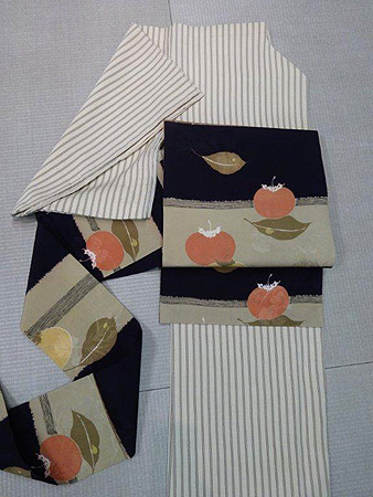 横段におしゃれな色の柿帯を合わせてモダンな装いをお楽しみください!