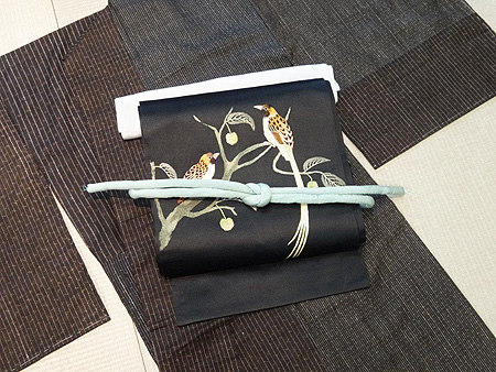 久米島切継袷に尾長鳥に木の実刺繍名古屋帯久米島切継袷