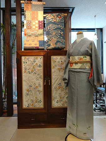 お着物は、明治の江戸小紋、大正更紗、昔の質の良い真綿で織られた紬などを寄せ合わせお仕立てした物など、新作のほとんどが灯屋2のアトリエから生まれた、世界でひとつだけの帯やお着物です。