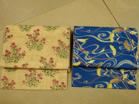桔梗と芝 麻地名古屋帯、女郎花と流水青色地絽縮緬染名古屋帯