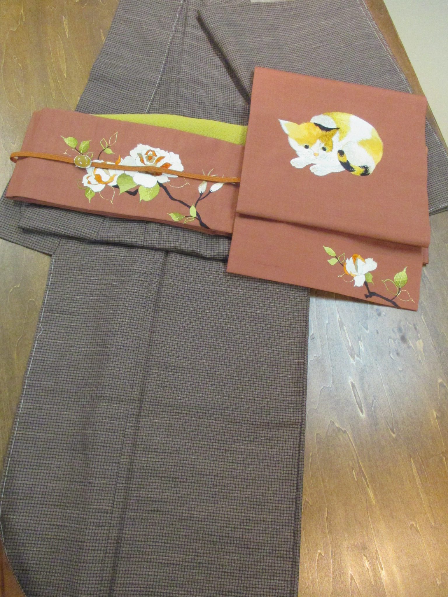 可愛らしい猫の刺繍帯に、茶色に黒の格子柄の紬の着物。