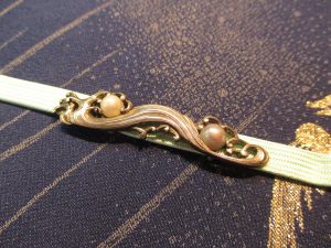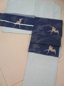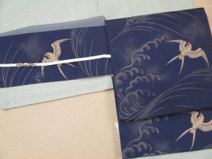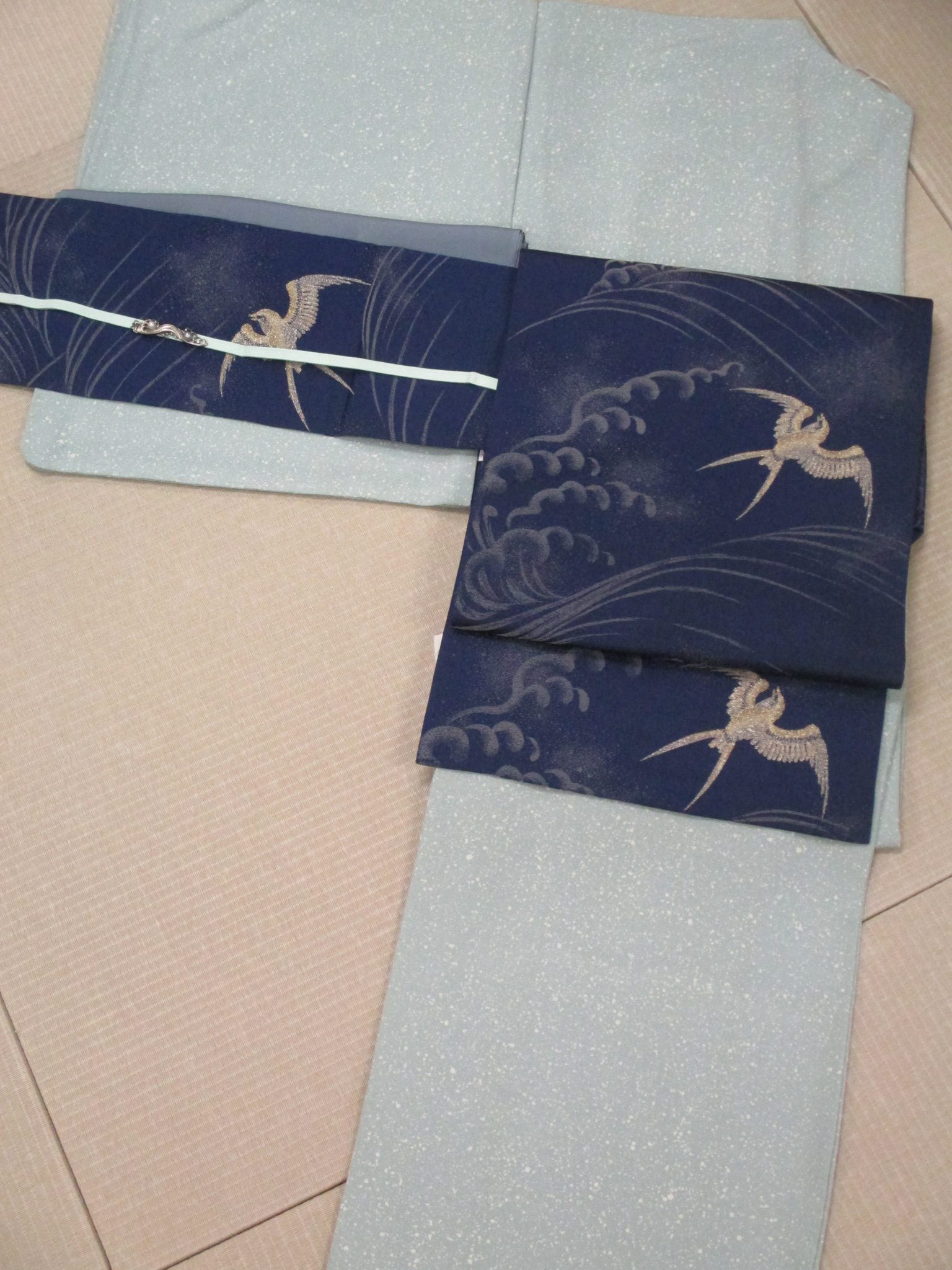 藍色の帯には、波間を飛躍するツバメ達の姿が、金・銀糸で織り出されています。