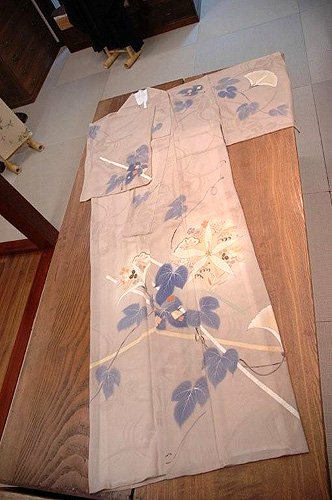 今日は一日雨が降ったりやんだりの薄暗い日でしたが、一枚の単衣を広げるとはっとほのあかりがともったような華やかな雰囲気になりました。
