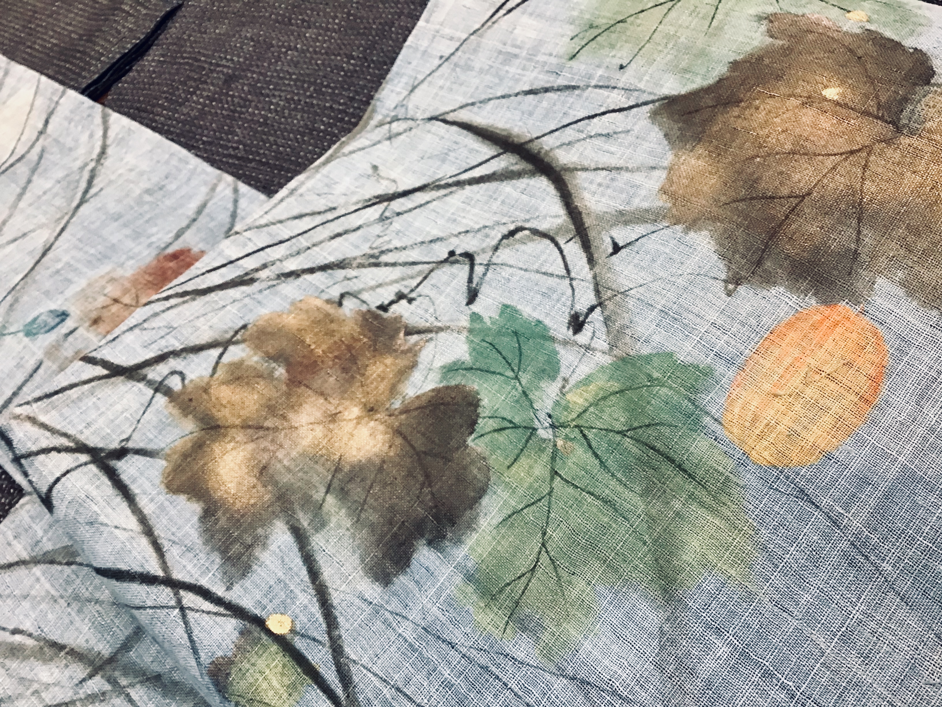 ご紹介の帯は、藍地に烏瓜や秋草が手書きで描かれた麻帯です。
