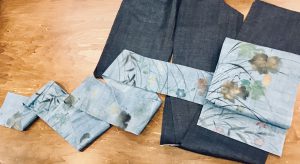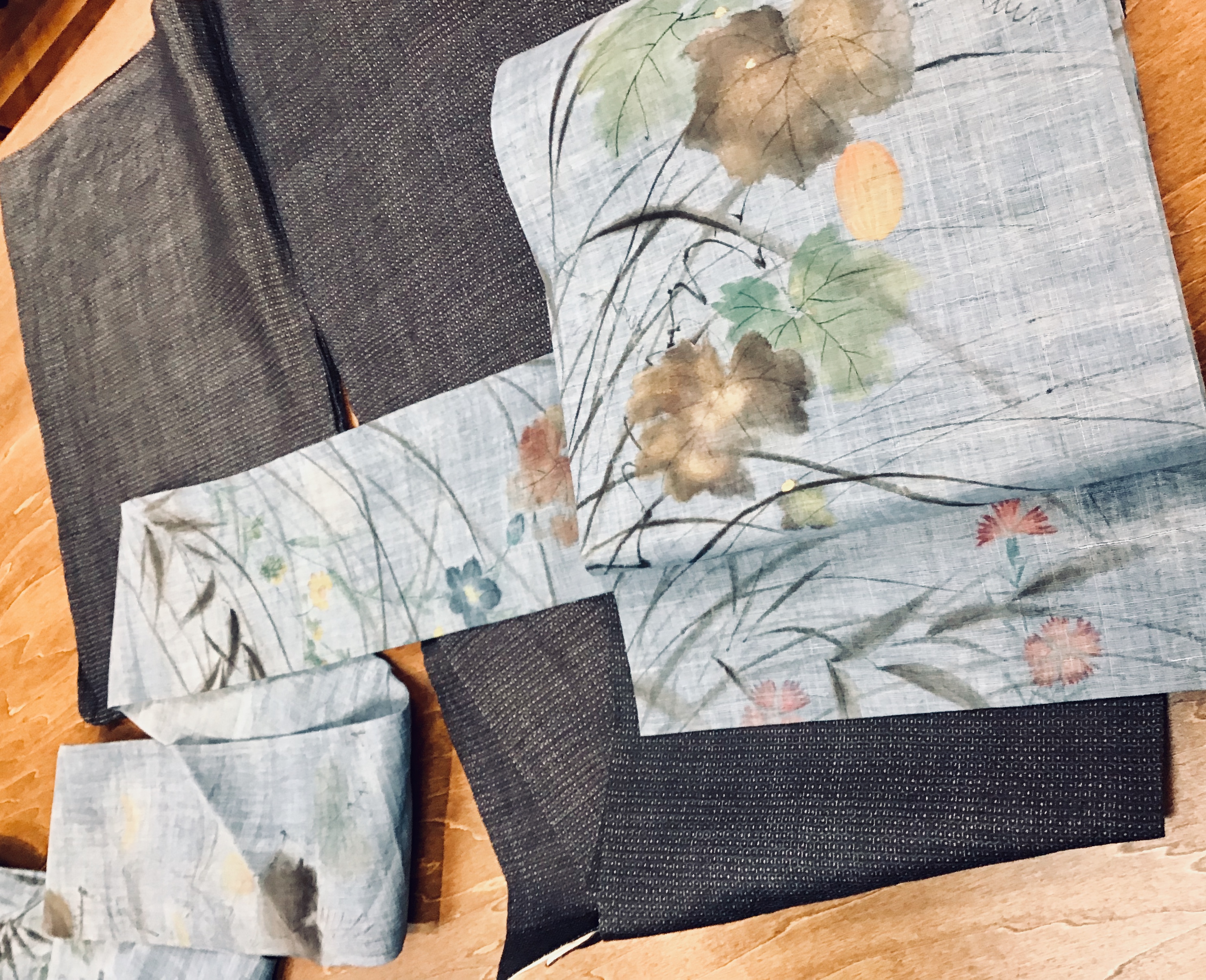 描かれた布を無駄にすることなく、見えないところで継ぎ合わせて華やかに仕立てました。