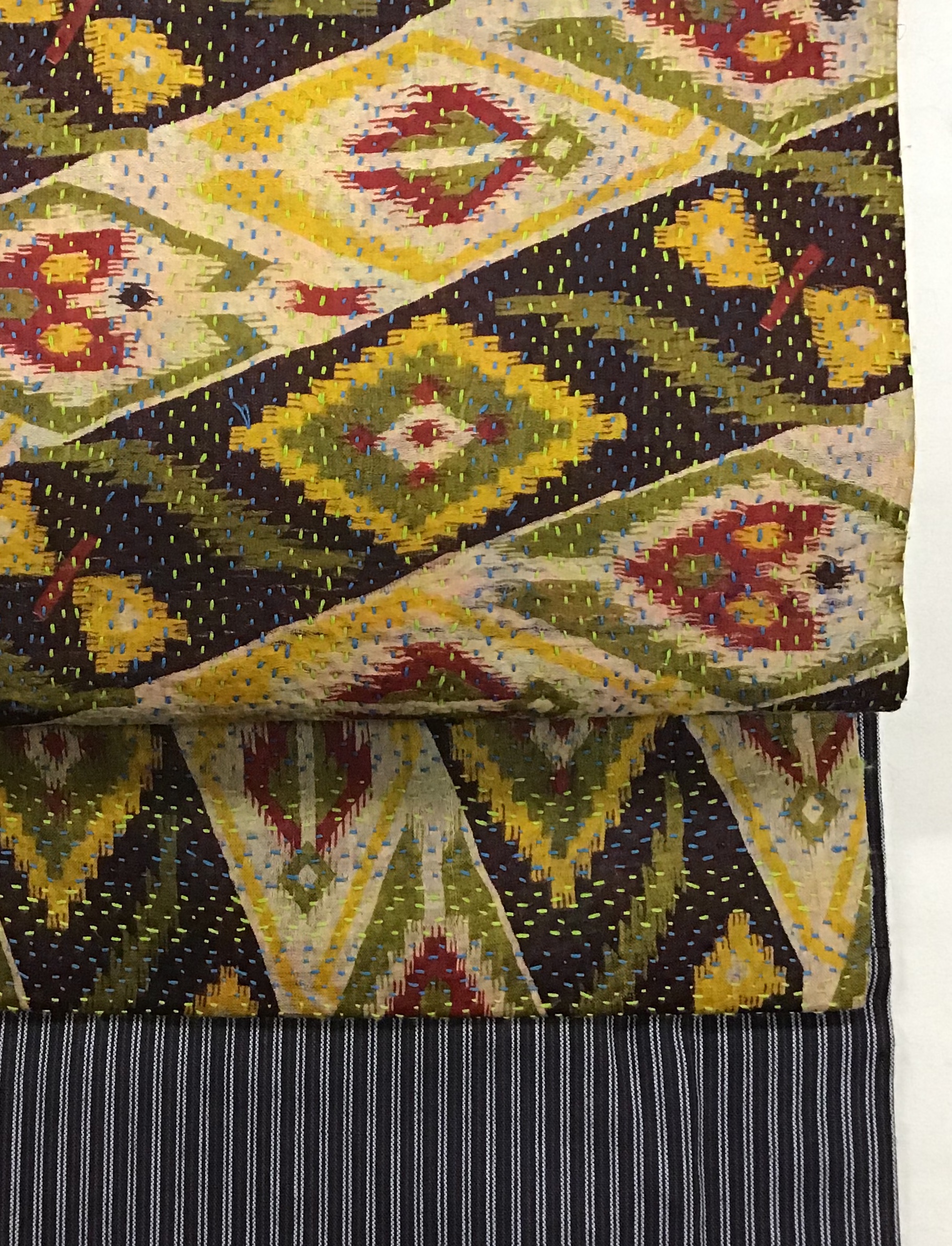 カラフルな地に、細かく布全体に刺し子がほどこされています。↑