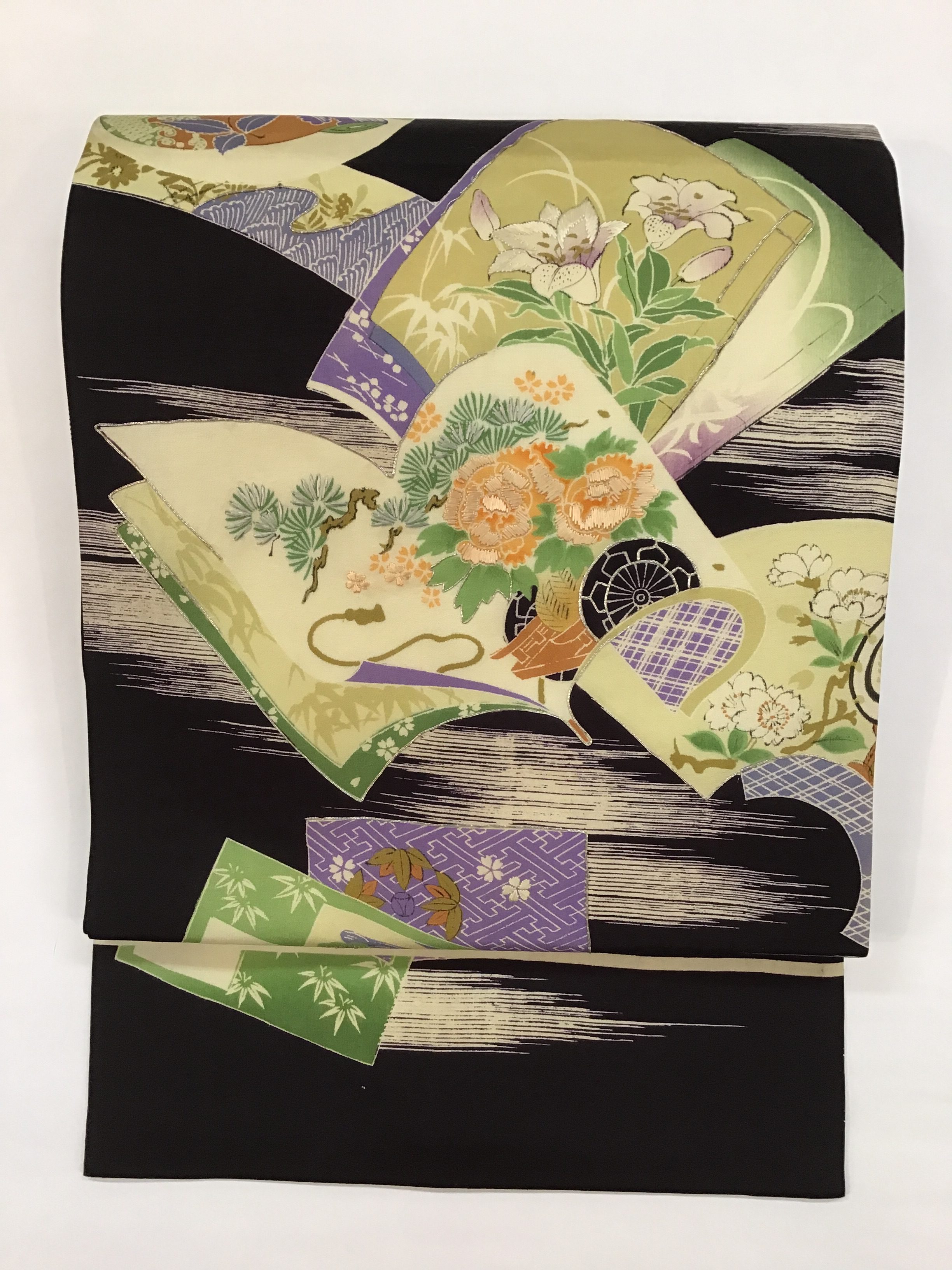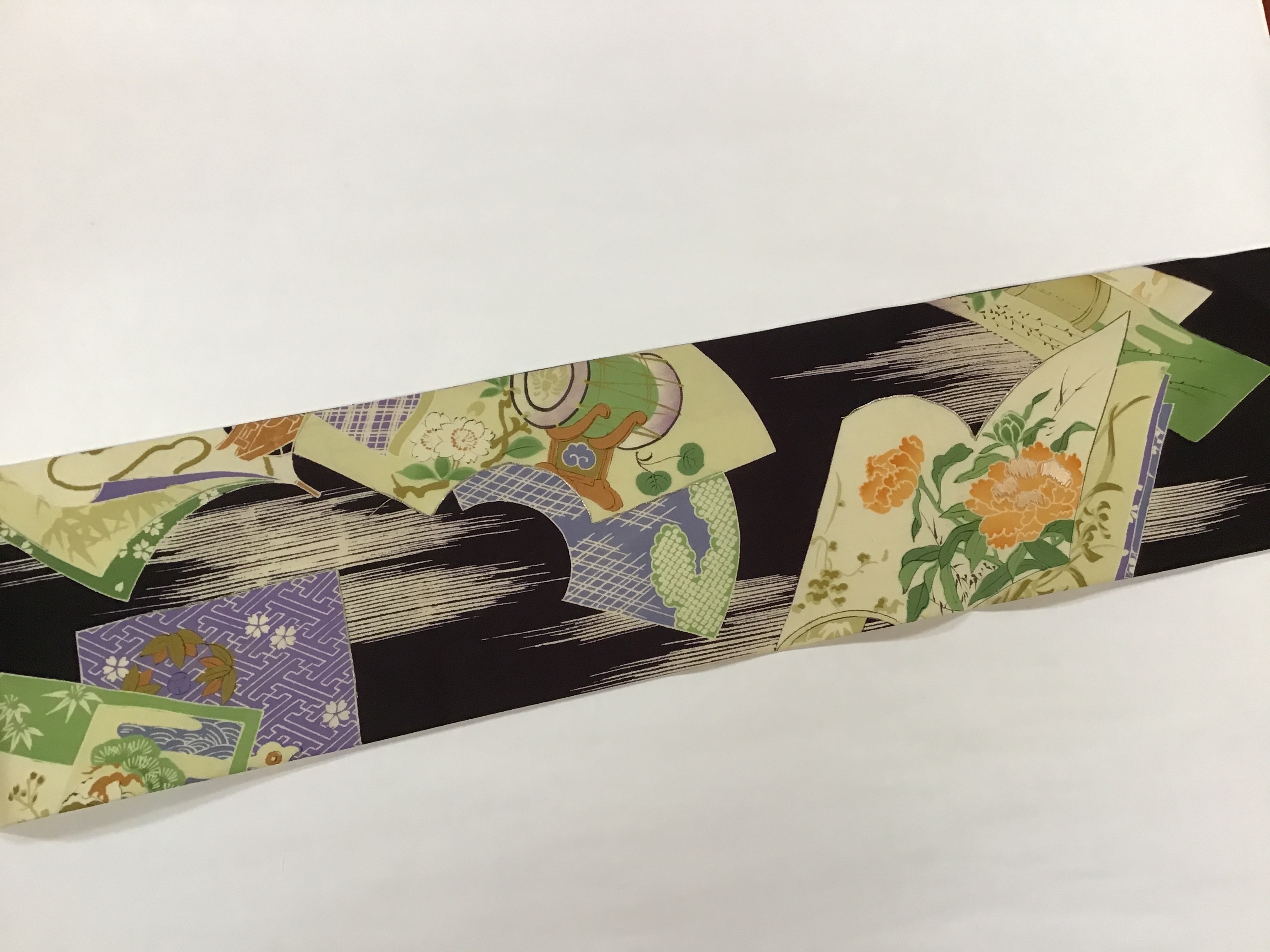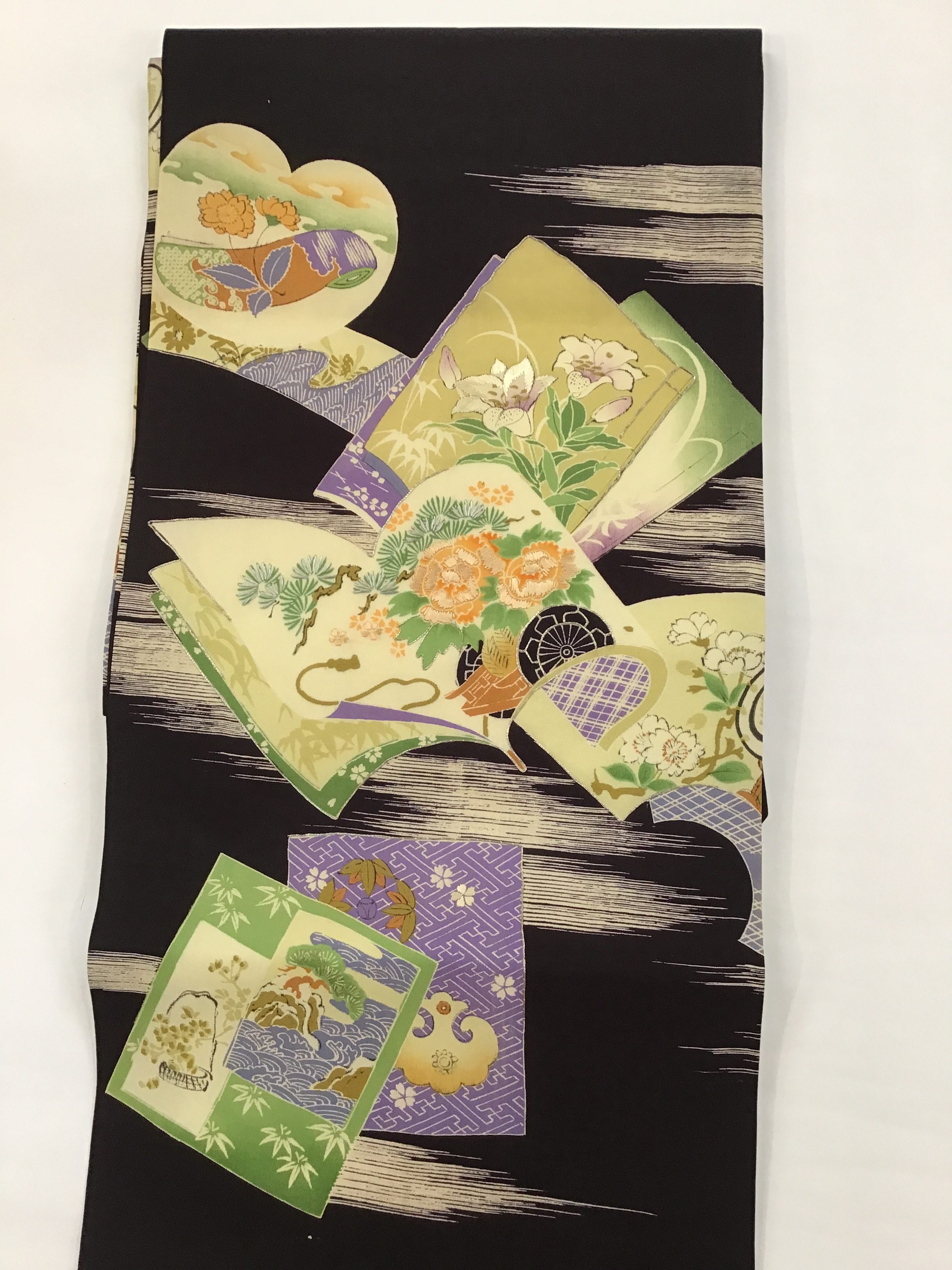 深く艶のある黒の帯地に冊子文、和歌、俳句や絵などを書く短冊文や団扇文、扇に貼る地紙文。それぞれ文の中に草花や風景が、描かれた優雅でとても美しい染の名古屋帯です。