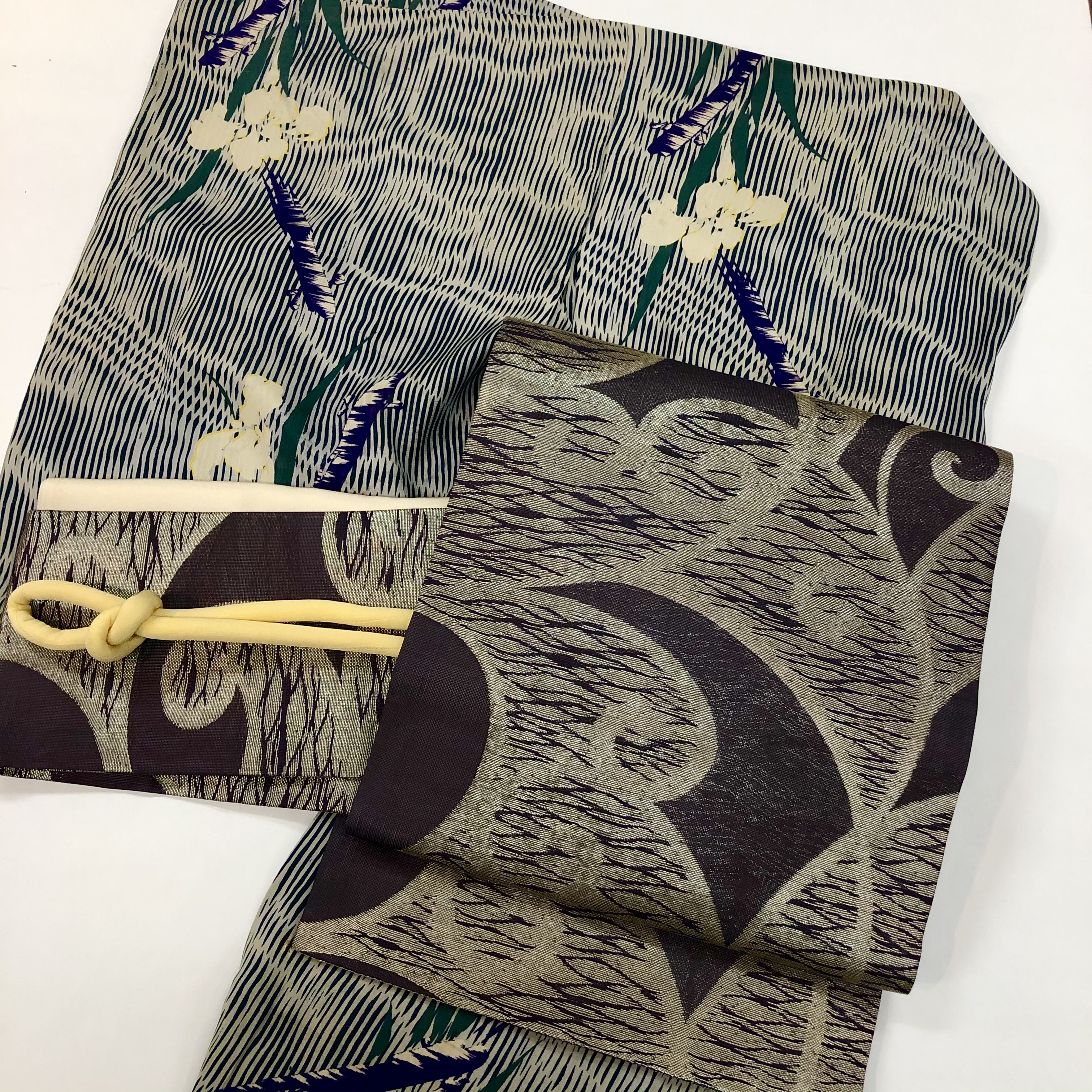 同系色で合せた帯は抑えた紫色と銀糸で織られた紗の帯。