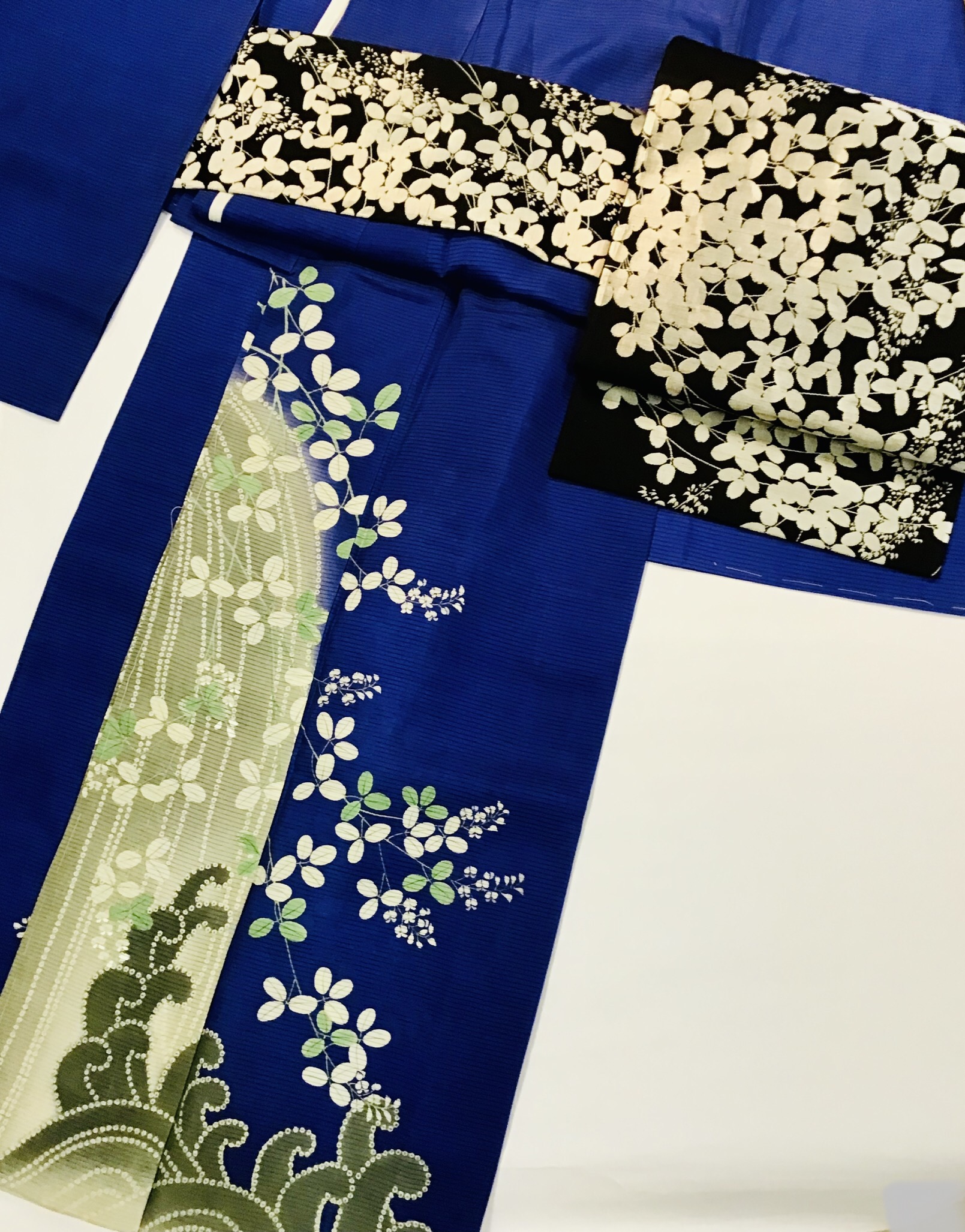 青色地滝に萩文様絽の両褄文様 38,500円(税込)