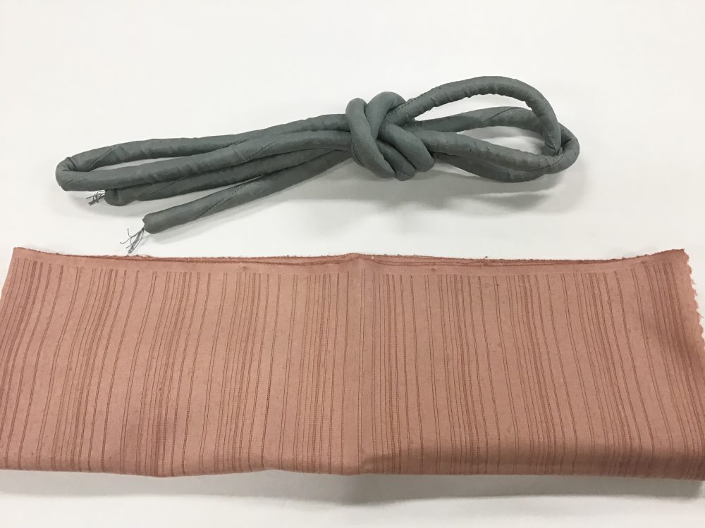 紬ベージュピンクの帯揚げと、羽二重でつるりとした艶のあるブルーグレーの丸ぐけを合せました。