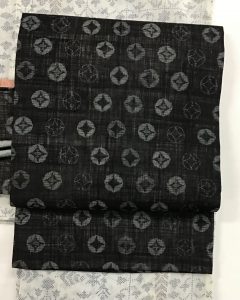 帯は、濃紺地の越後上布絣です。丸にダイ柄が、キラキラしているようでキュート!!