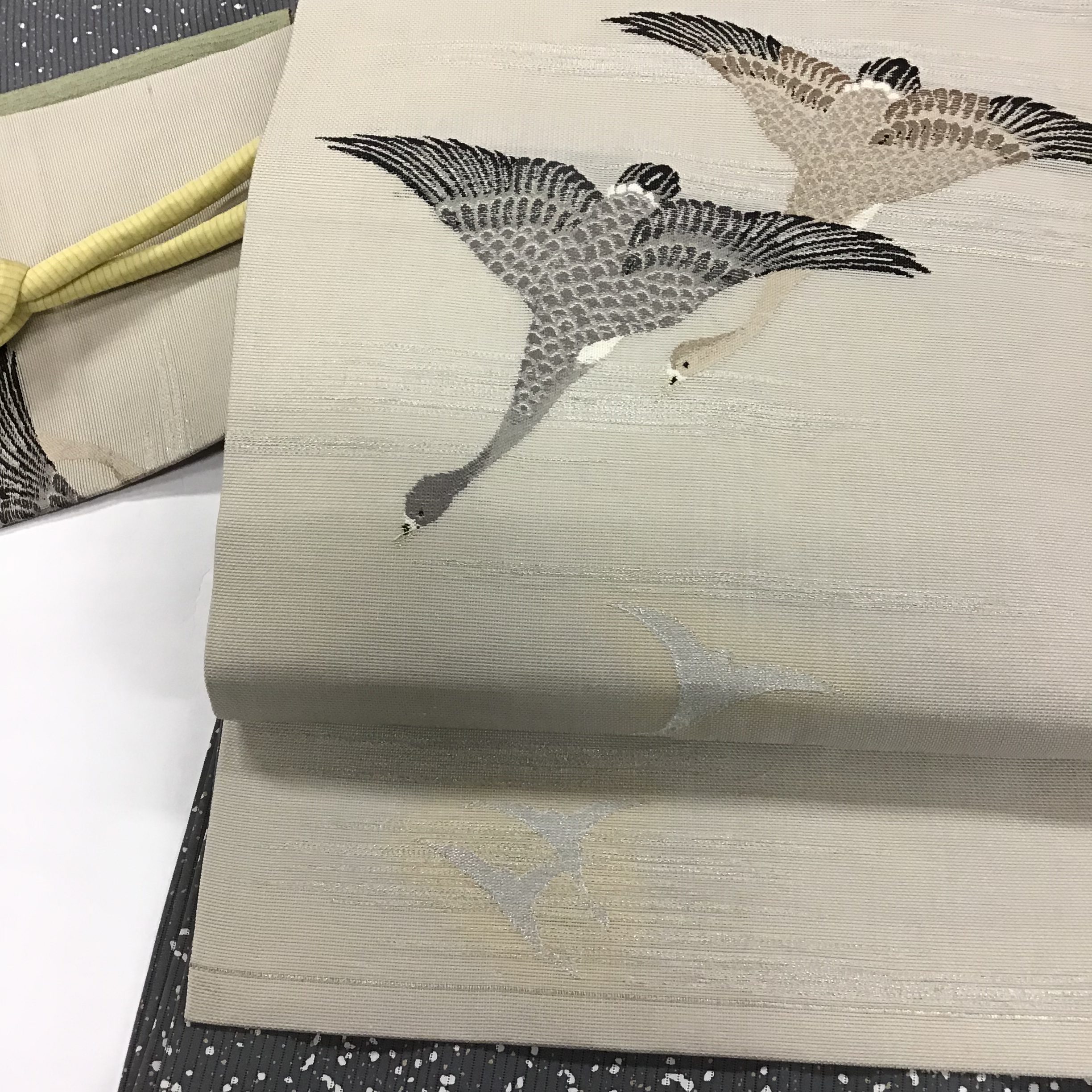 次の帯は、2羽の雁が、織られた上品な色合いの名古屋帯です。