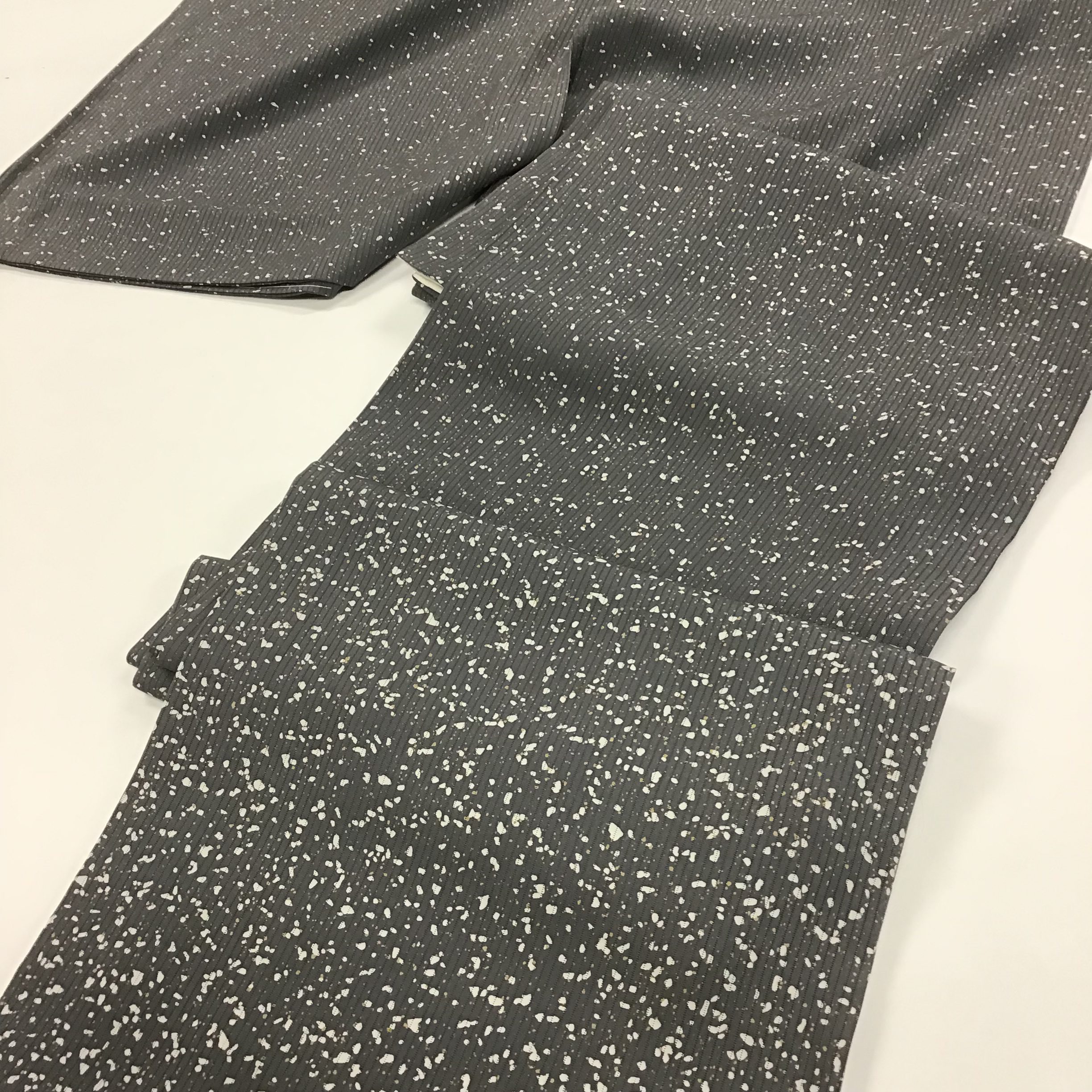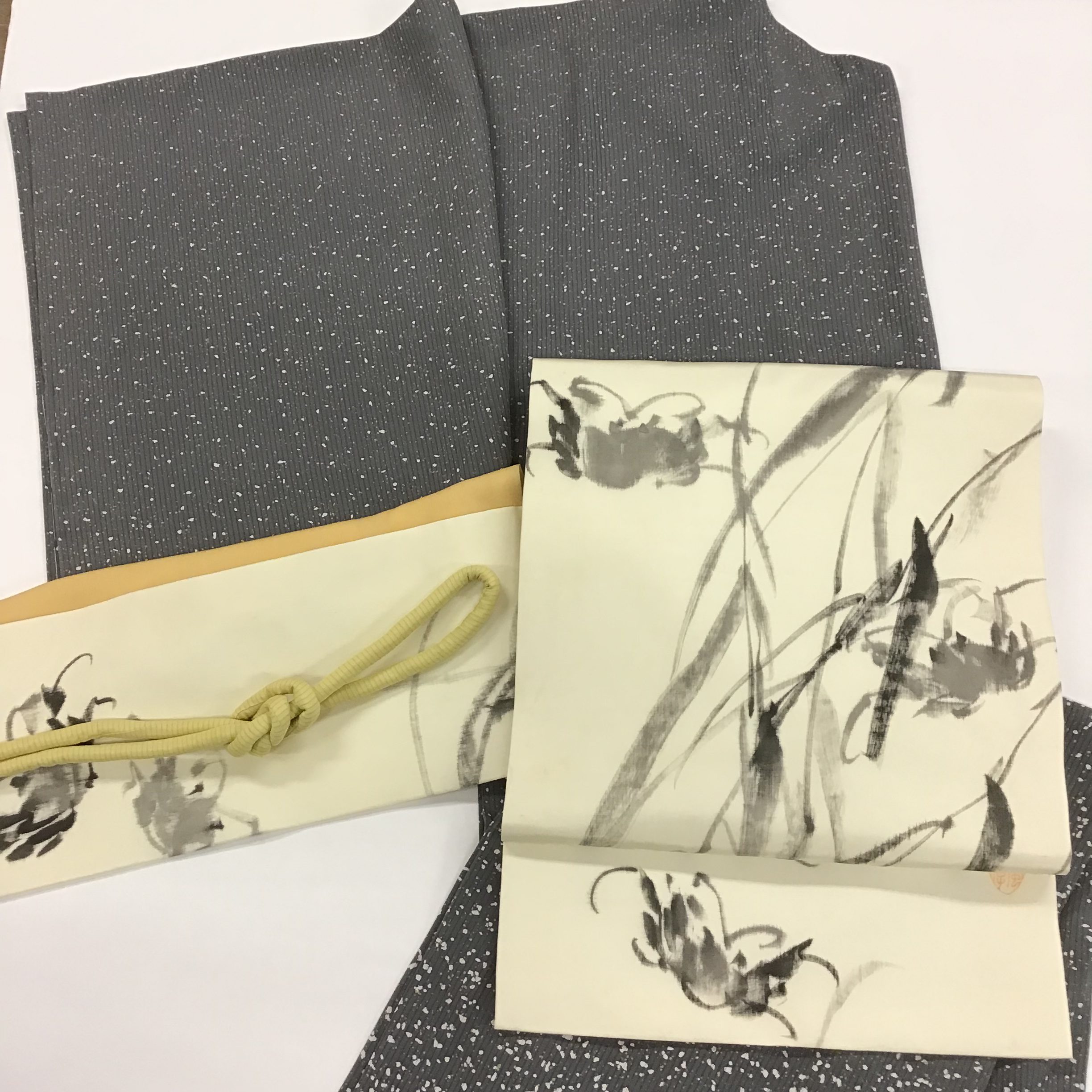 ご紹介するのは、やや濃いめのグレー地に白と黄土色で涼感を感じる粉雪のように撒き糊友禅されたに思われる上品な着物です。