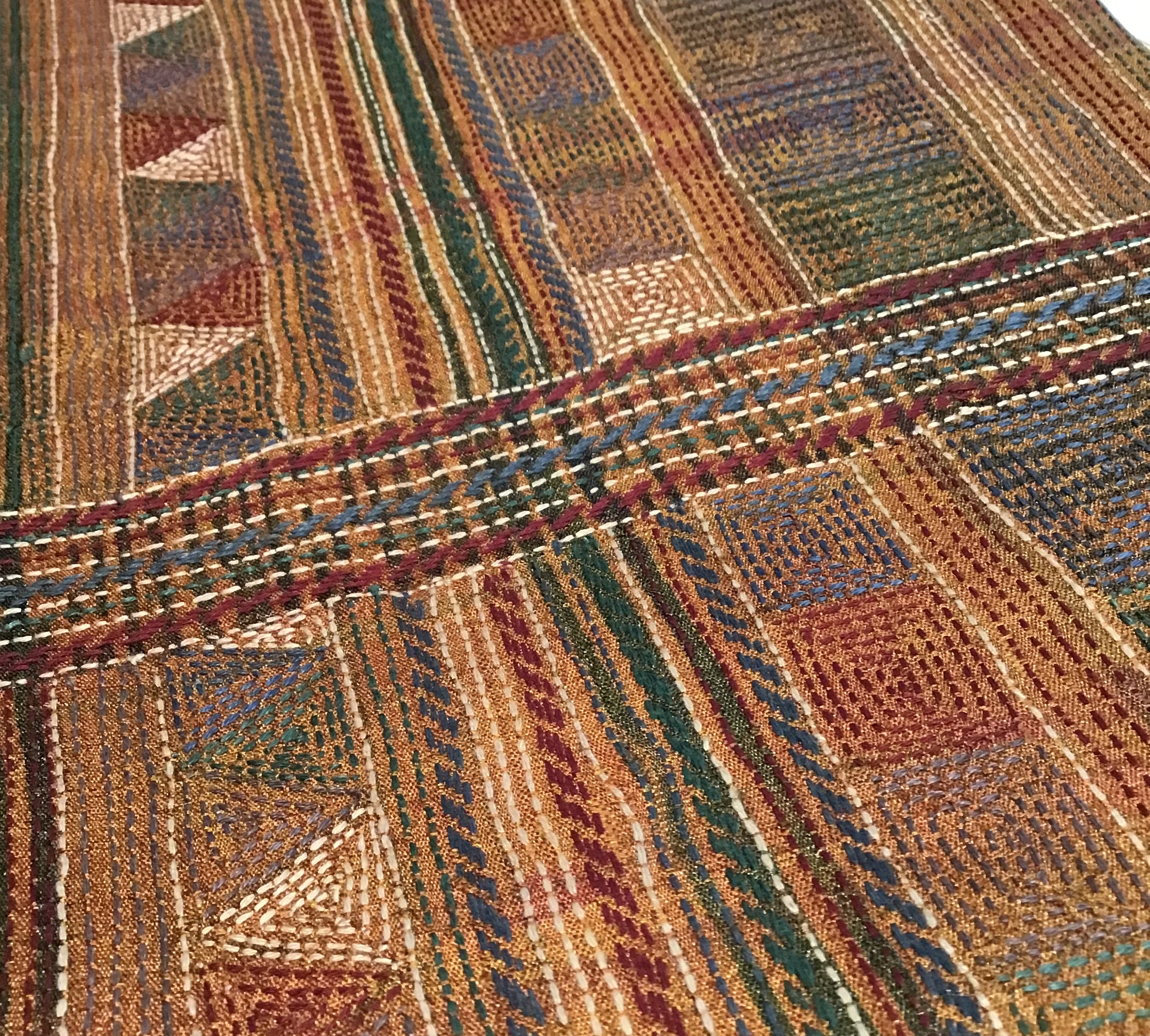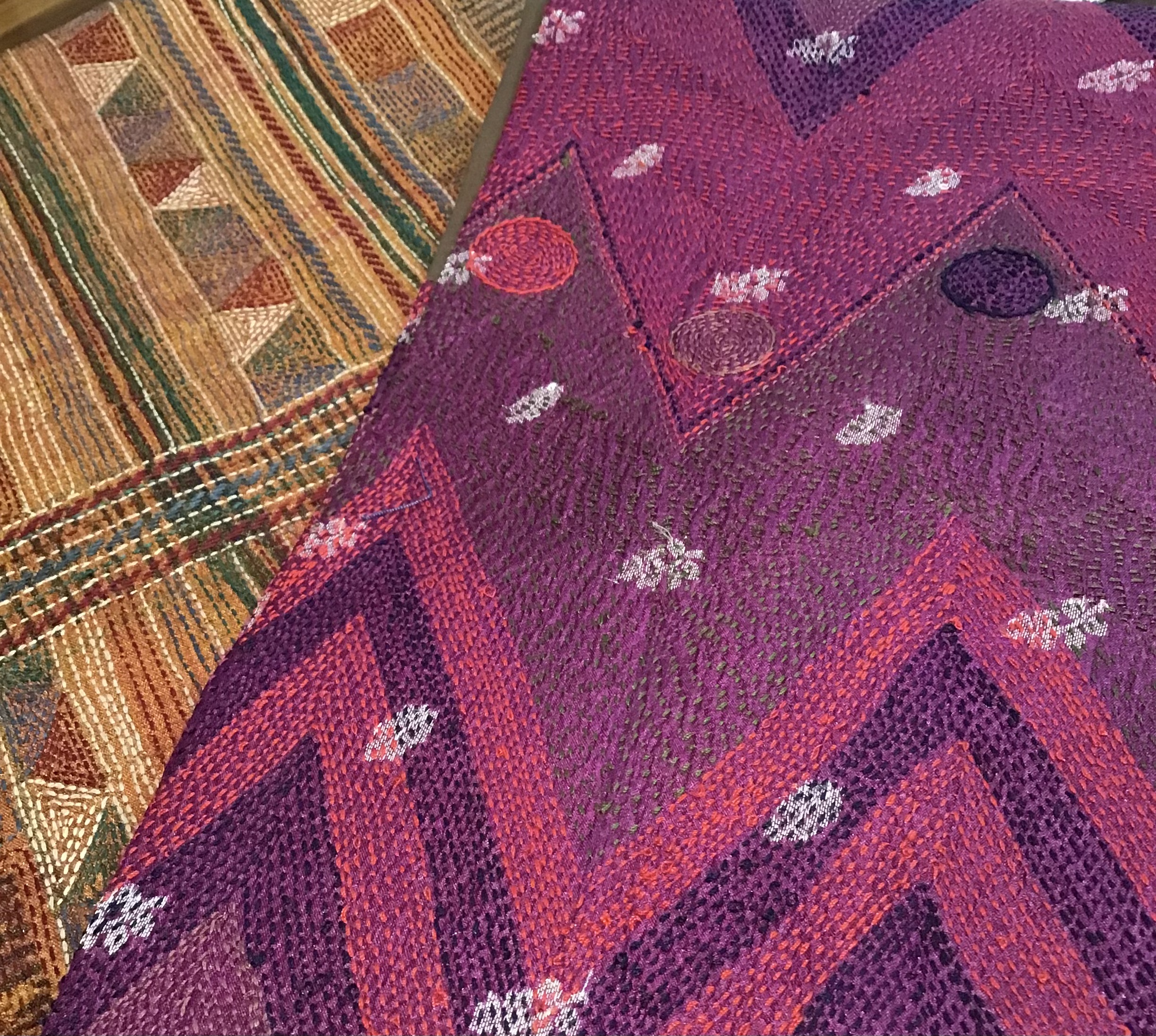 カンタワークとはインドのベンガル地方に伝わる刺子の伝統技法で、幾何学文様が中心ですが、多様な色使いや、素朴な糸目が魅力です。