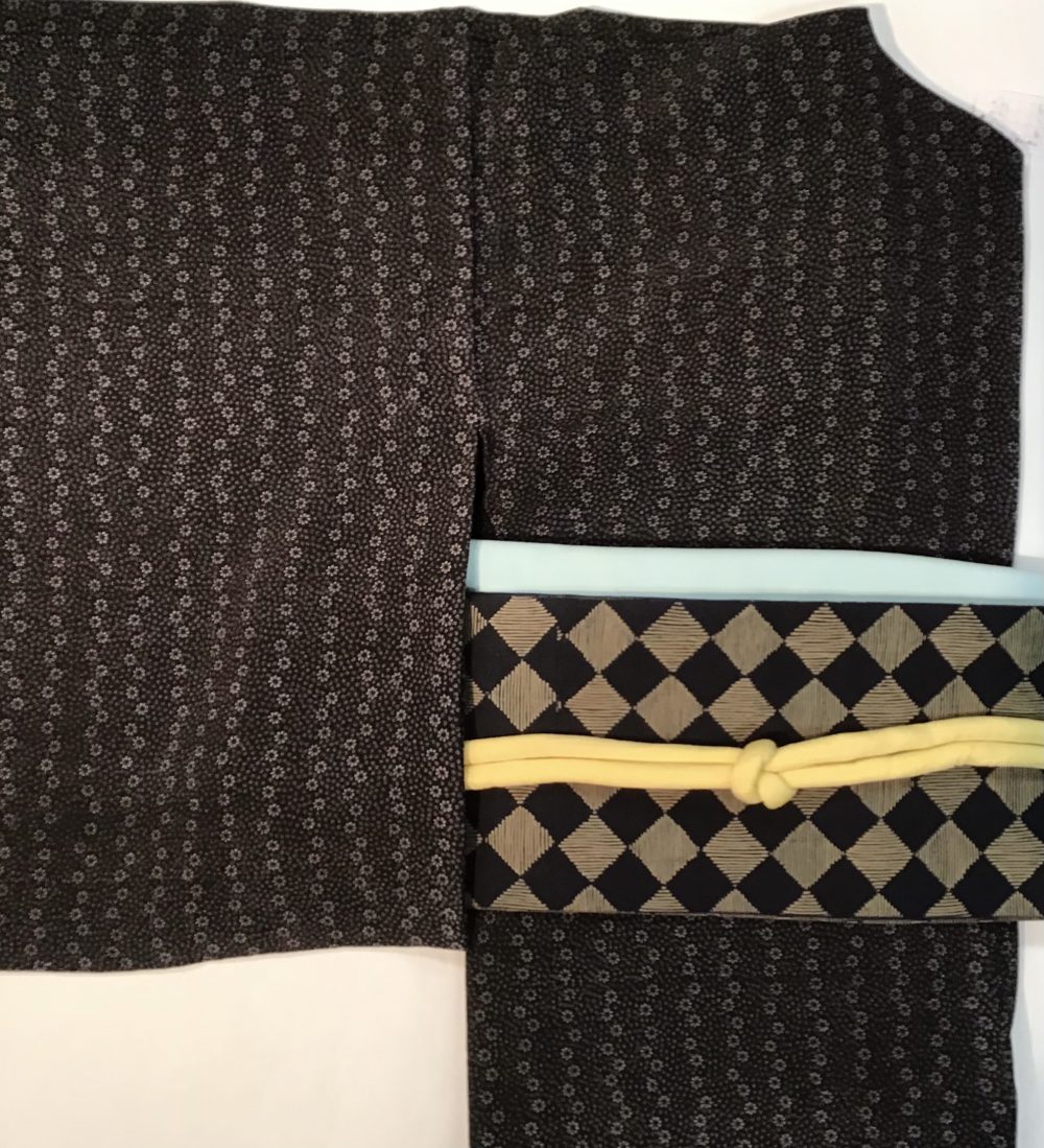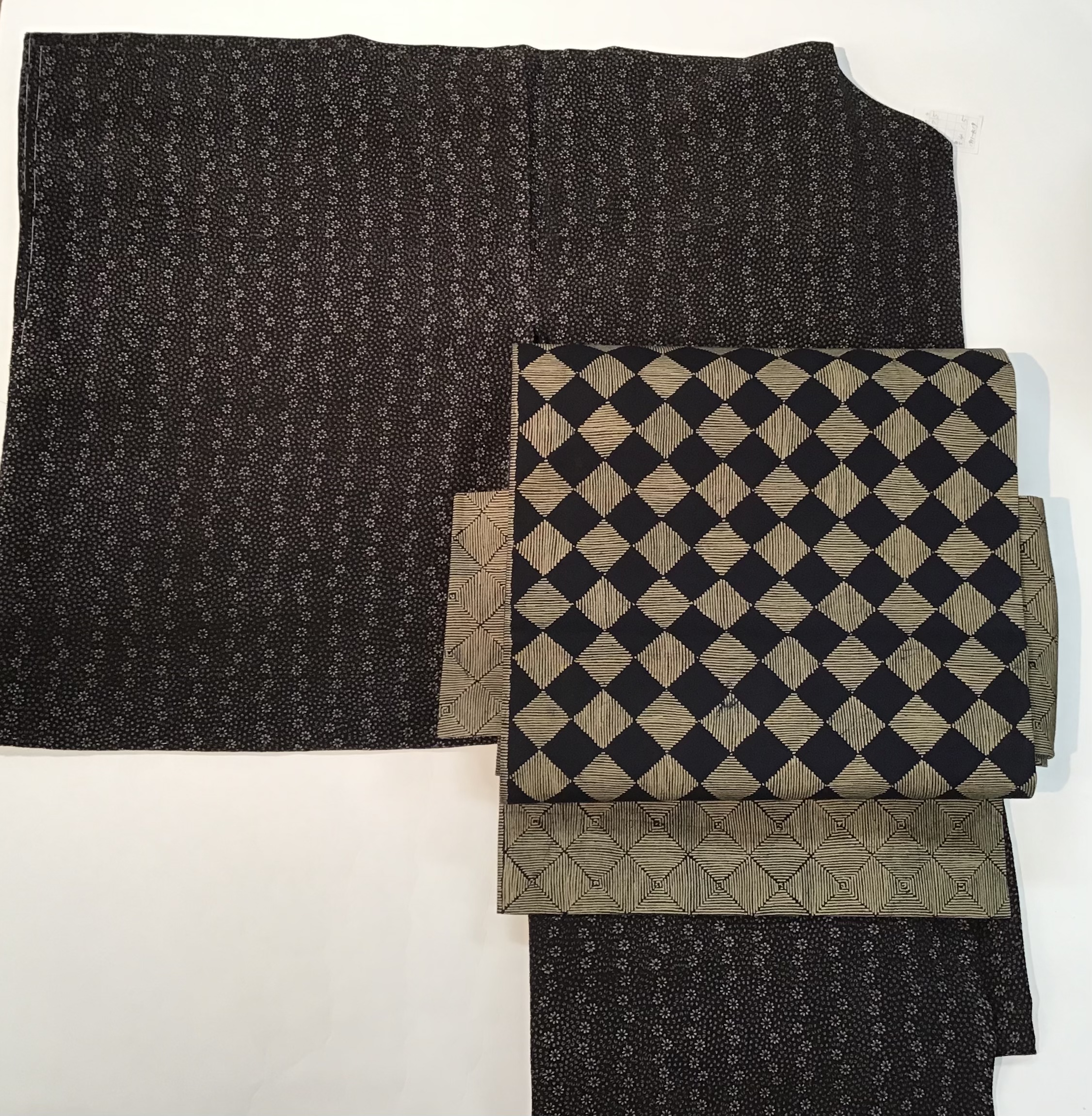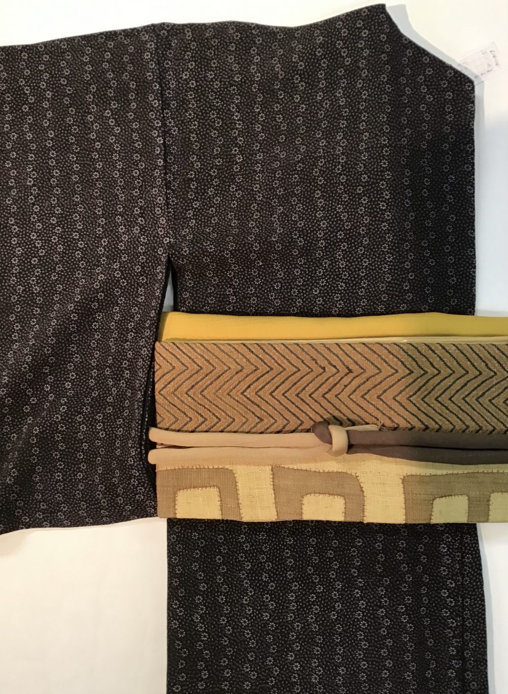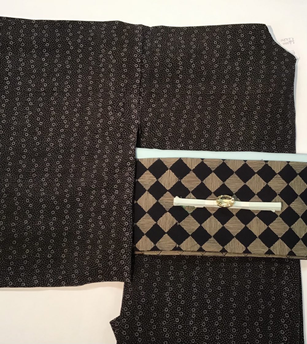 袷の黒地のちりめんの着物に、シックでモダンな外国裂帯を合わせてみました。