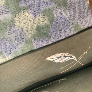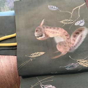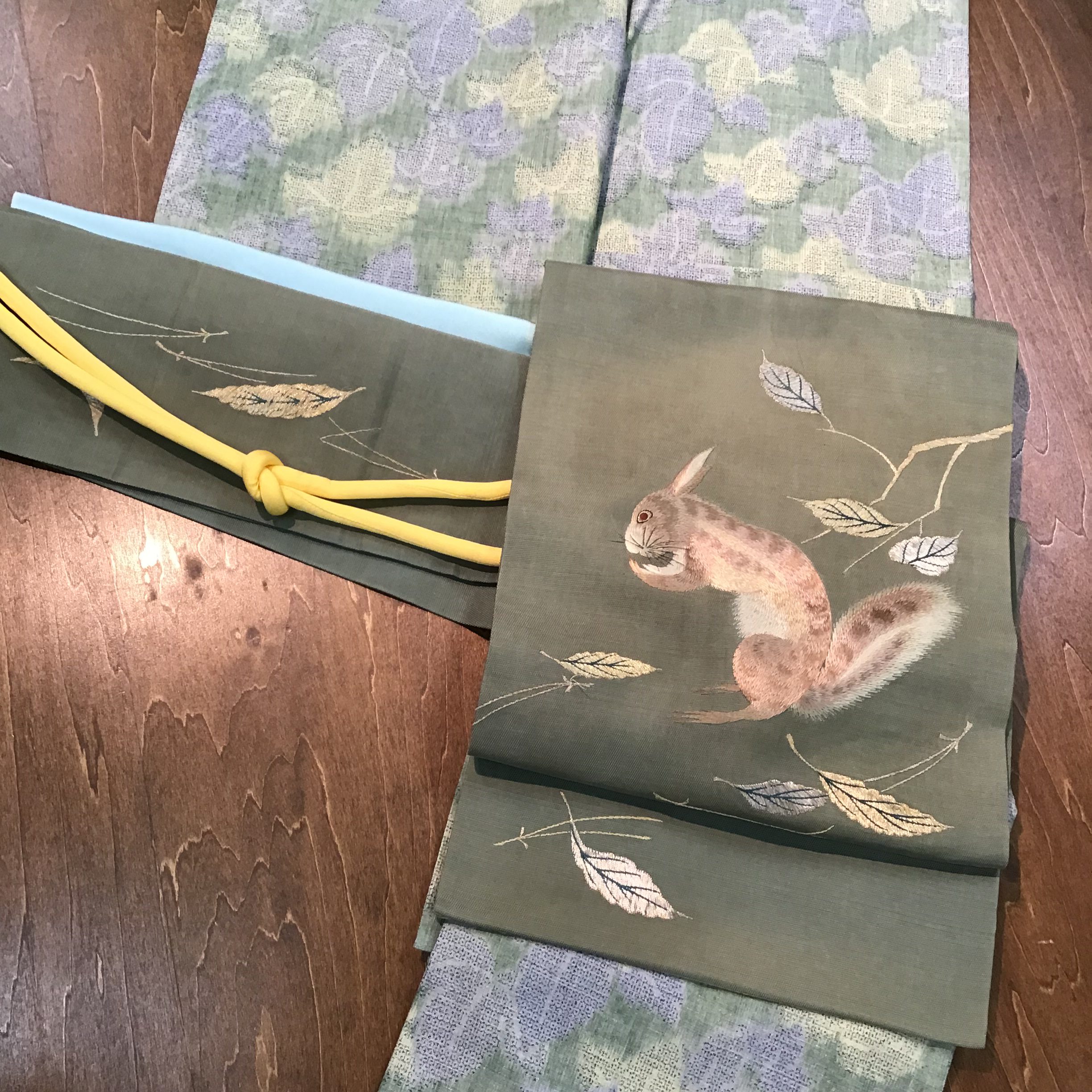 まずは、同じく落ち着いたグリーン系の地色にクヌギを頬張るリスが可愛く刺繍された帯。