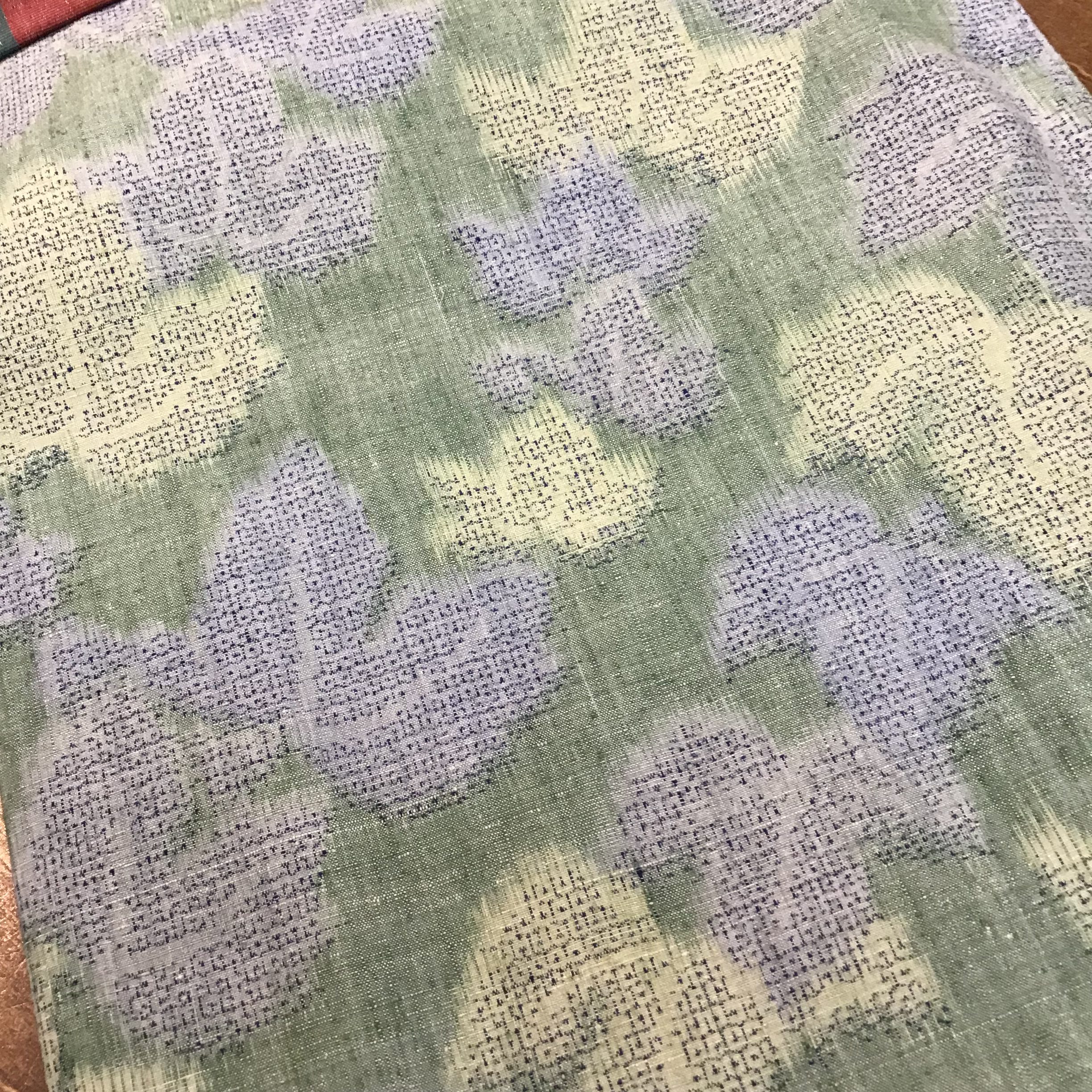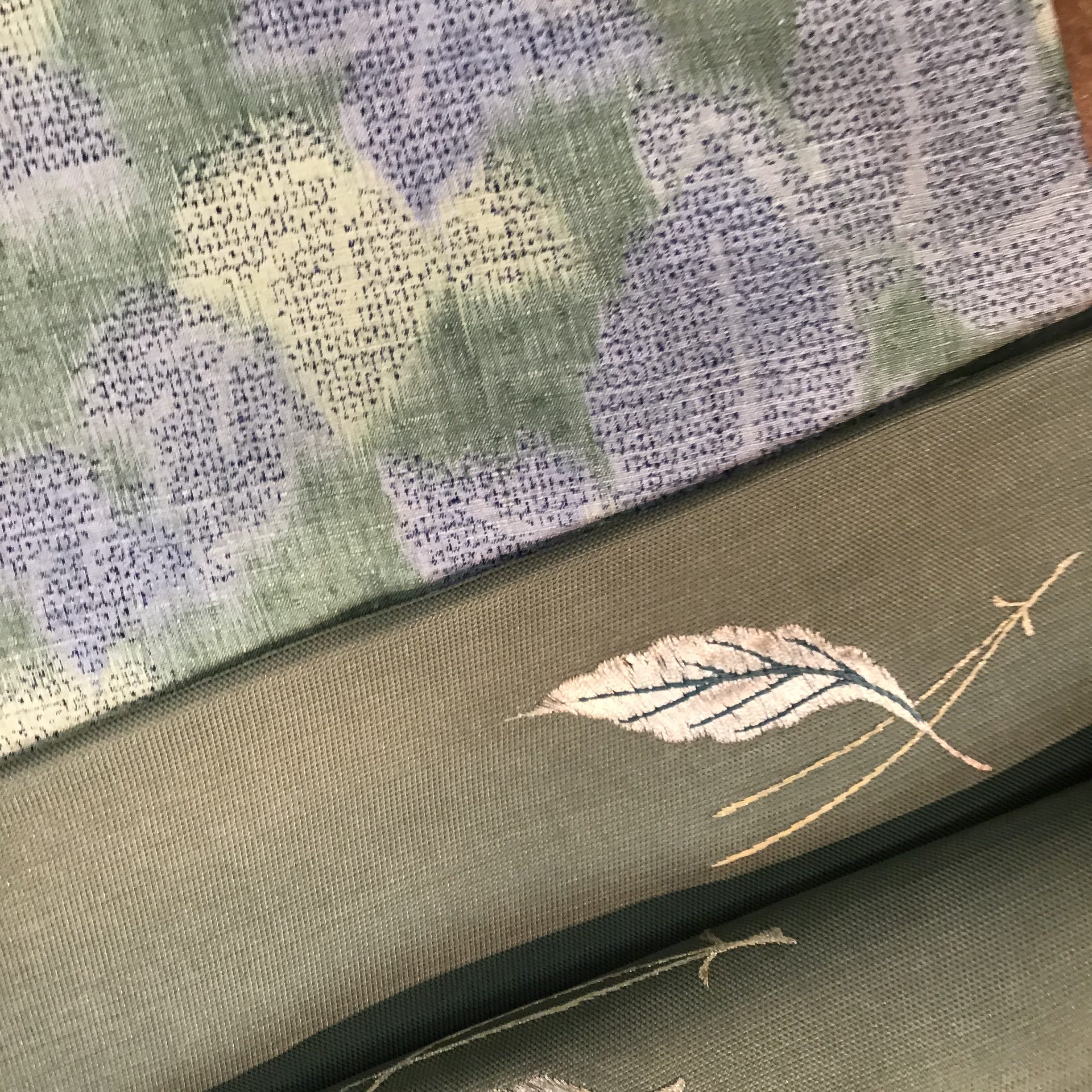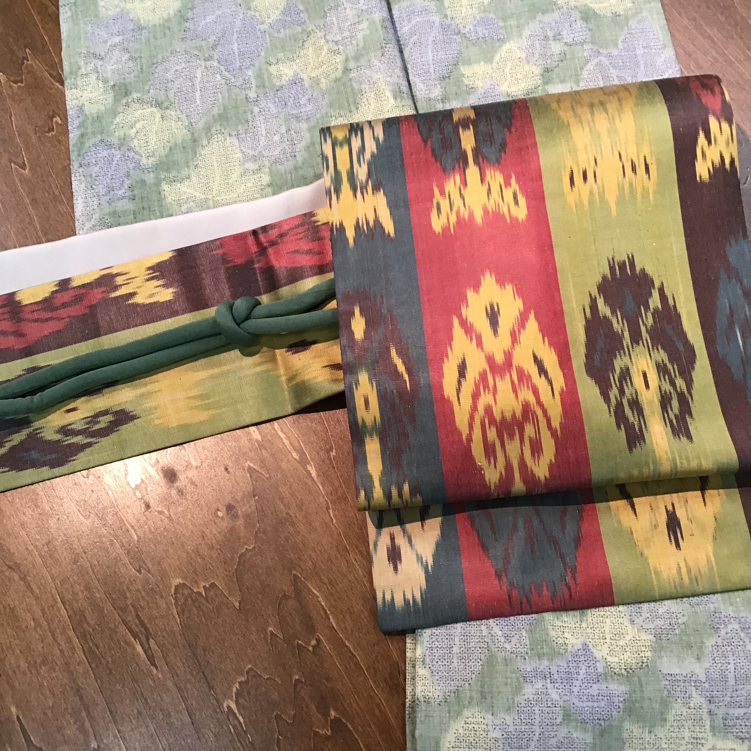 異なった2色のグリーンにくすんだ赤、青、黄、茶色が入った帯。
