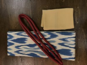 前で結んで、仕上がってから後ろに回すので、背中に帯を当て、テを膝より少し長めにとります。