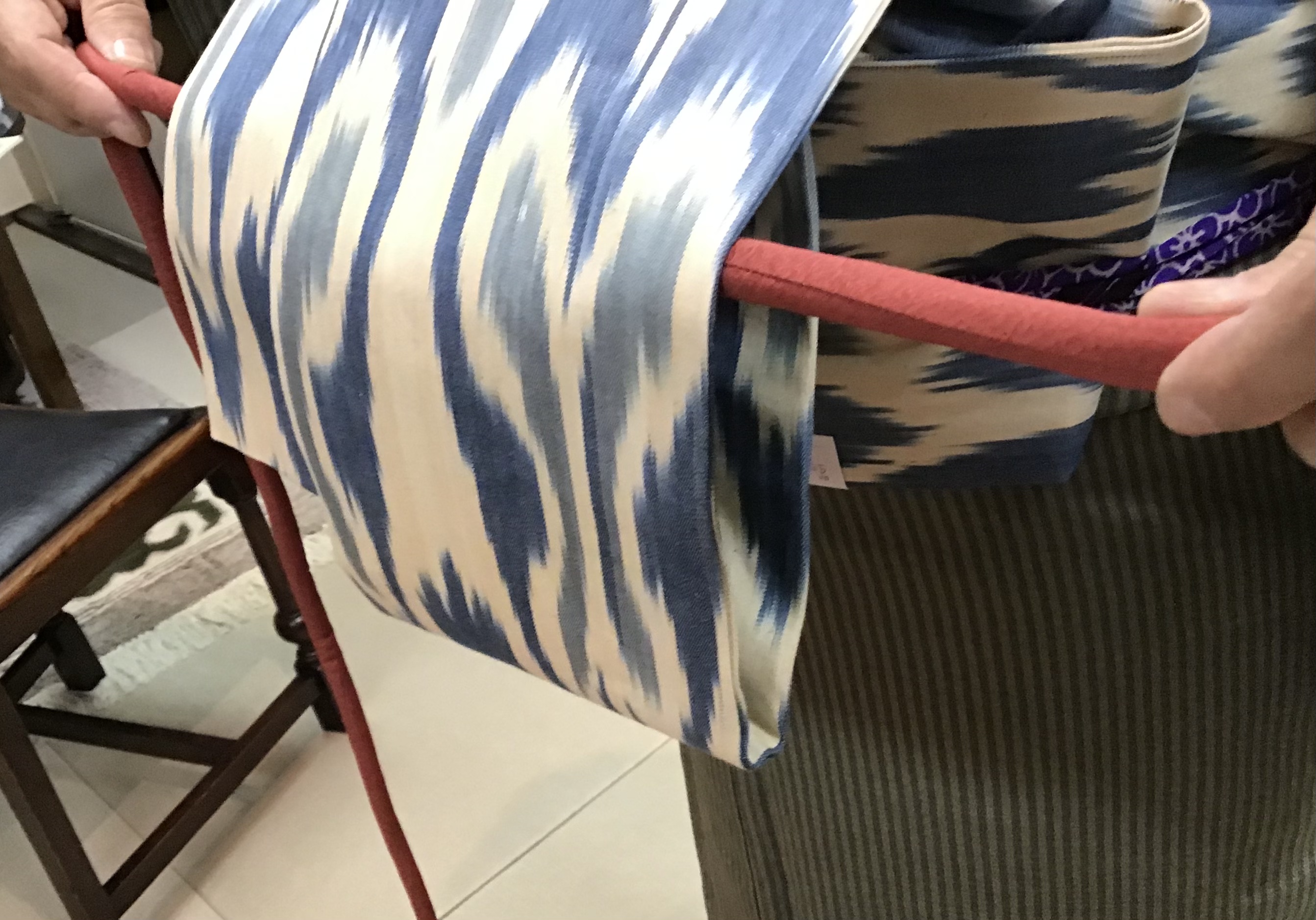この結び方は、短い方のテを折りたたんでタレにしています。長い方のタレを二重に重ねて広げることで、小ぶりのお太鼓ができます。タレとお太鼓の向きが変わって、柄が縦横になるところが、とてもかわいいのです。