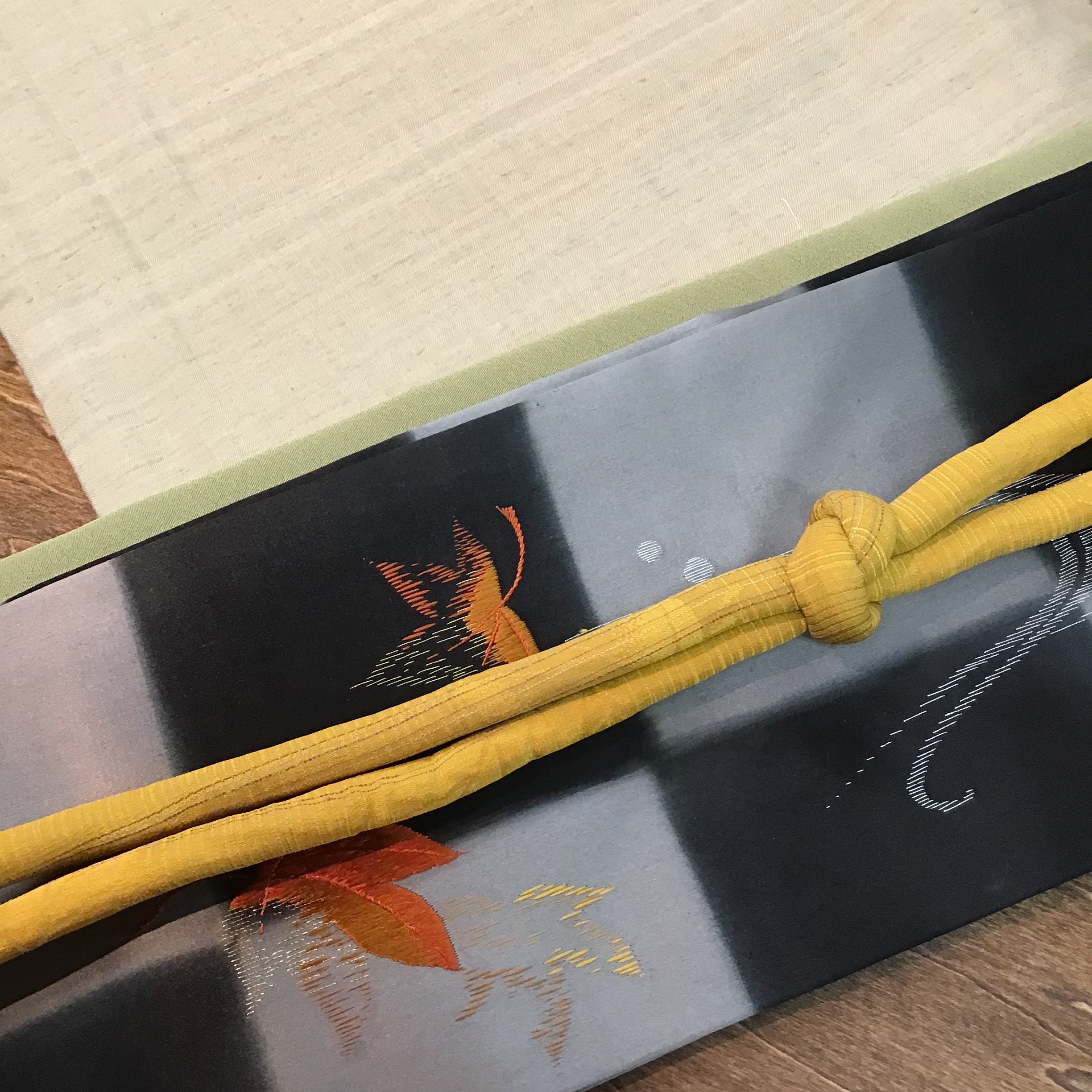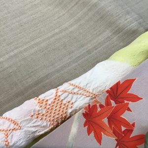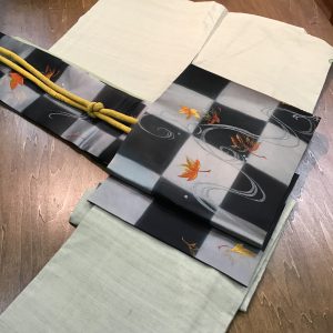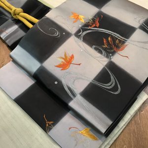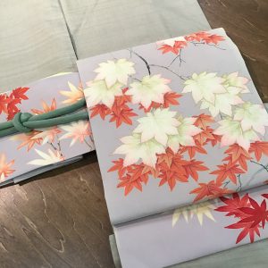 次にご紹介するのは、光琳水に浮かぶ紅葉、光沢のある帯地。こちらは12月いっぱいお使いいただけます。