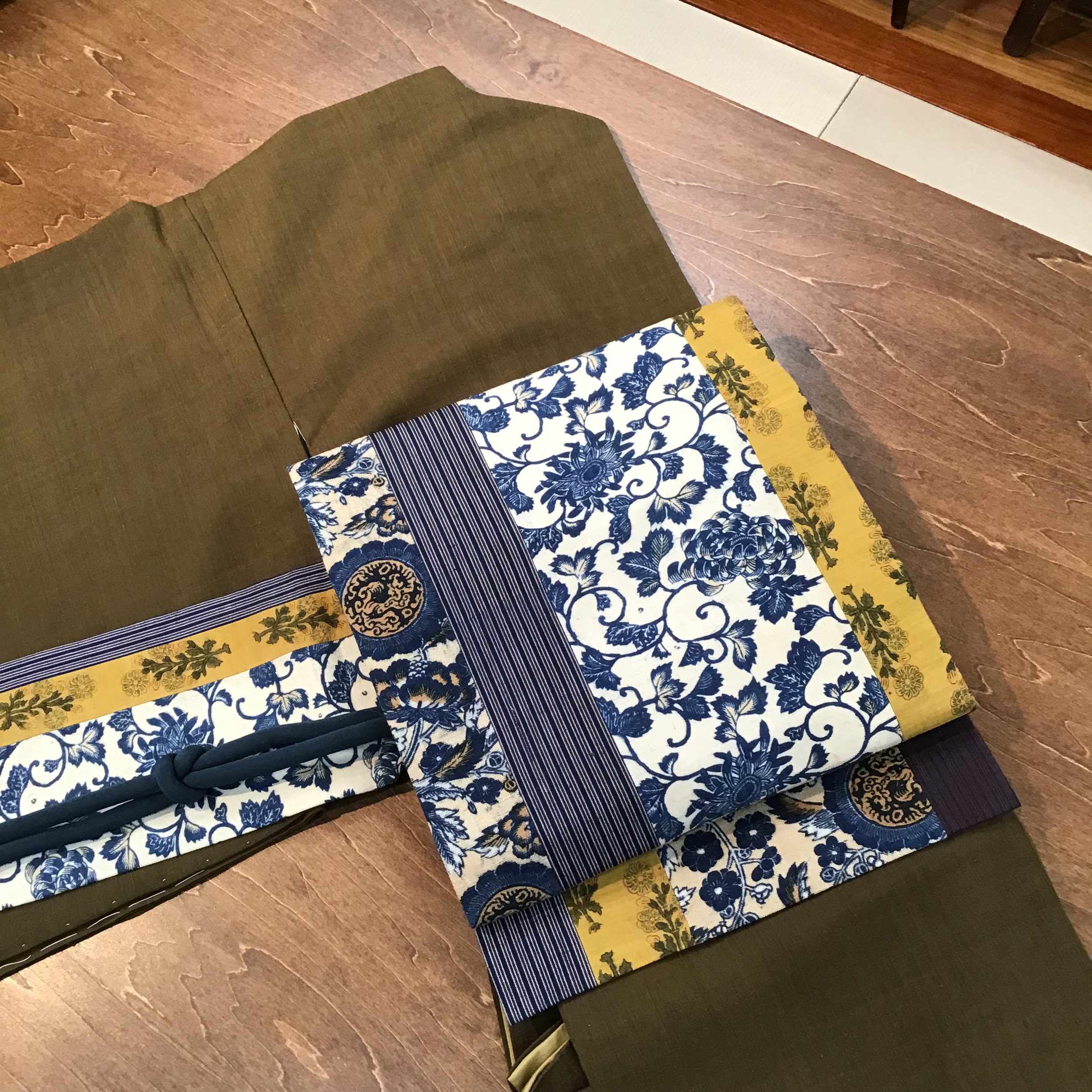カーキ色結城縮着物 132,000円 裄1尺7寸5分 身丈4尺5分
