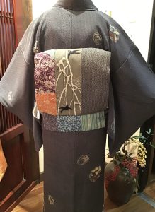 雪持ち柳の中をカラスたちが、戯れる明治期の衣装裂を江戸期の裂と継いだ、灯屋2の創作帯をお召しです。