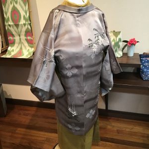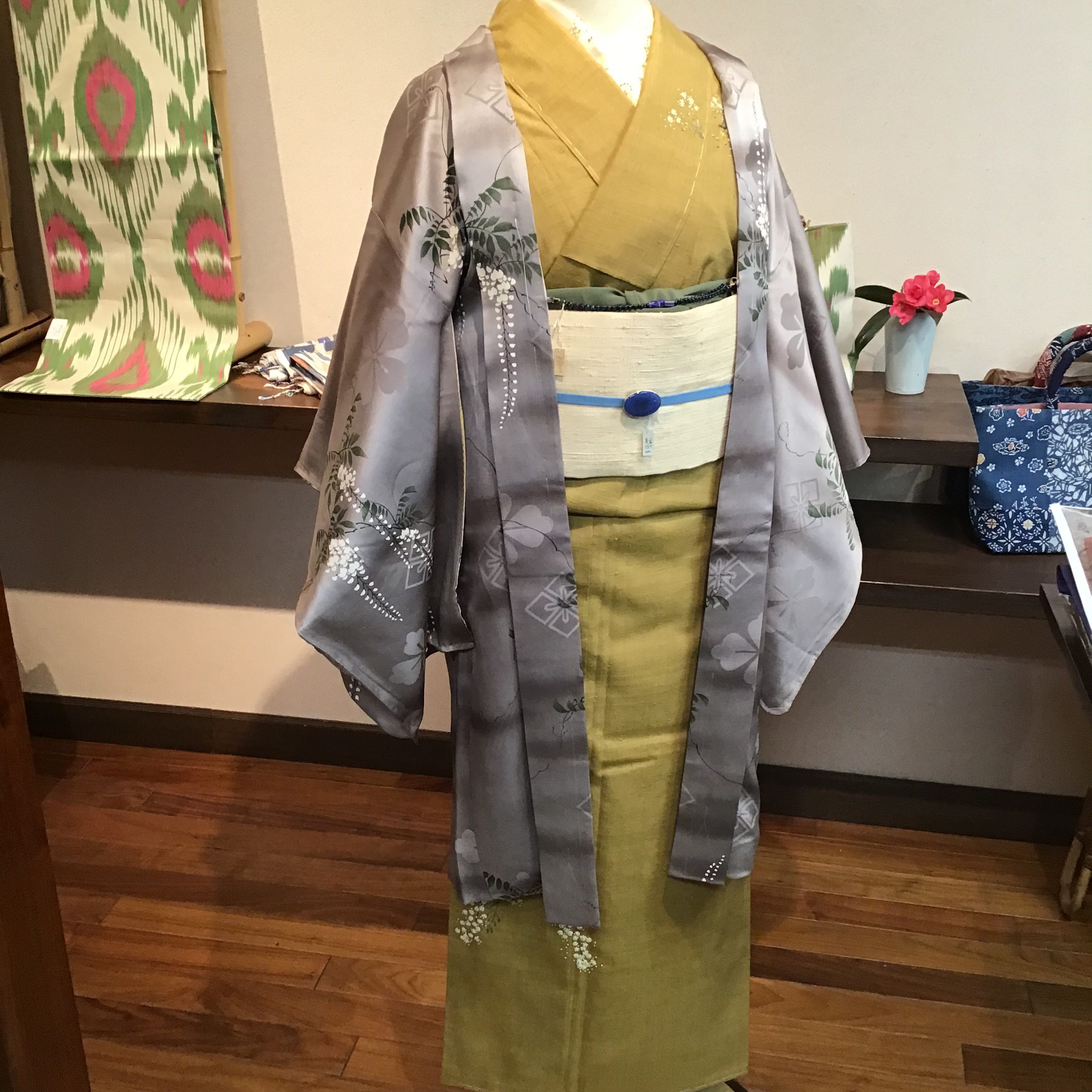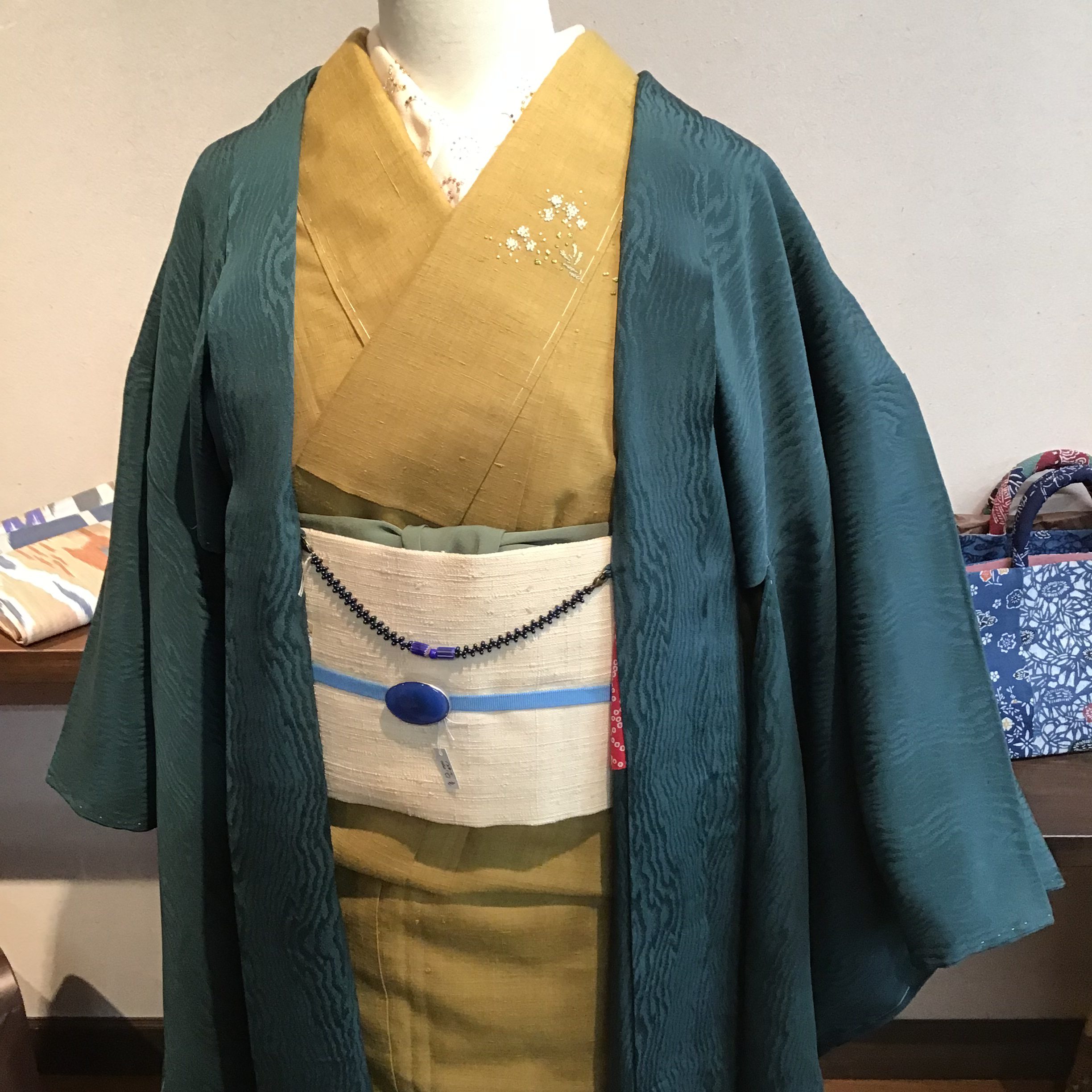 最後に抑えたグリーンに木目模様の地紋が美しい羽織です。