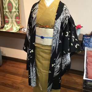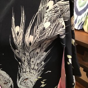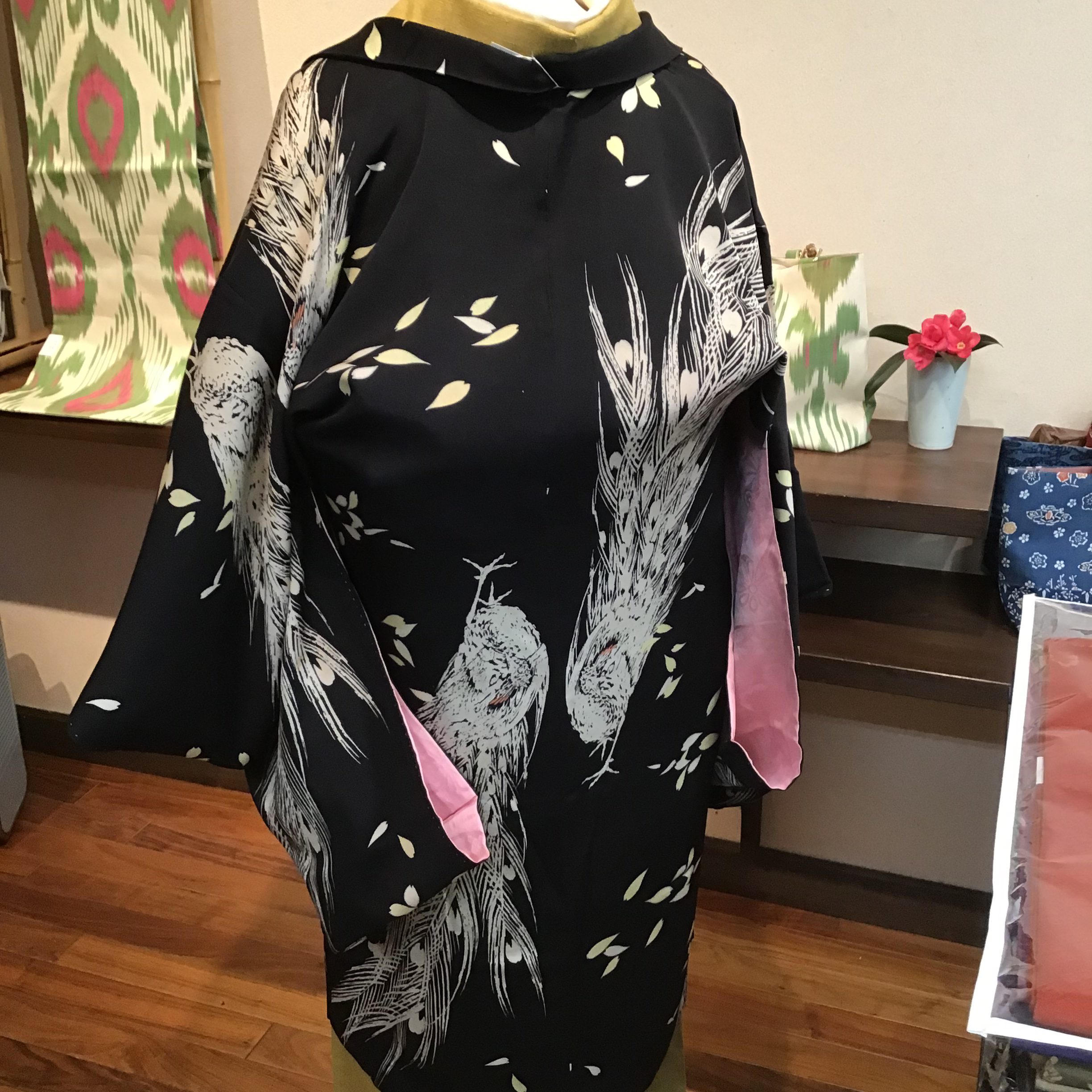 まずは、優雅な羽根を持つ孔雀が、型友禅染されている黒羽織。
