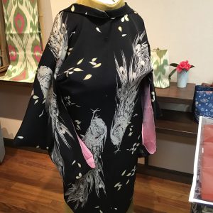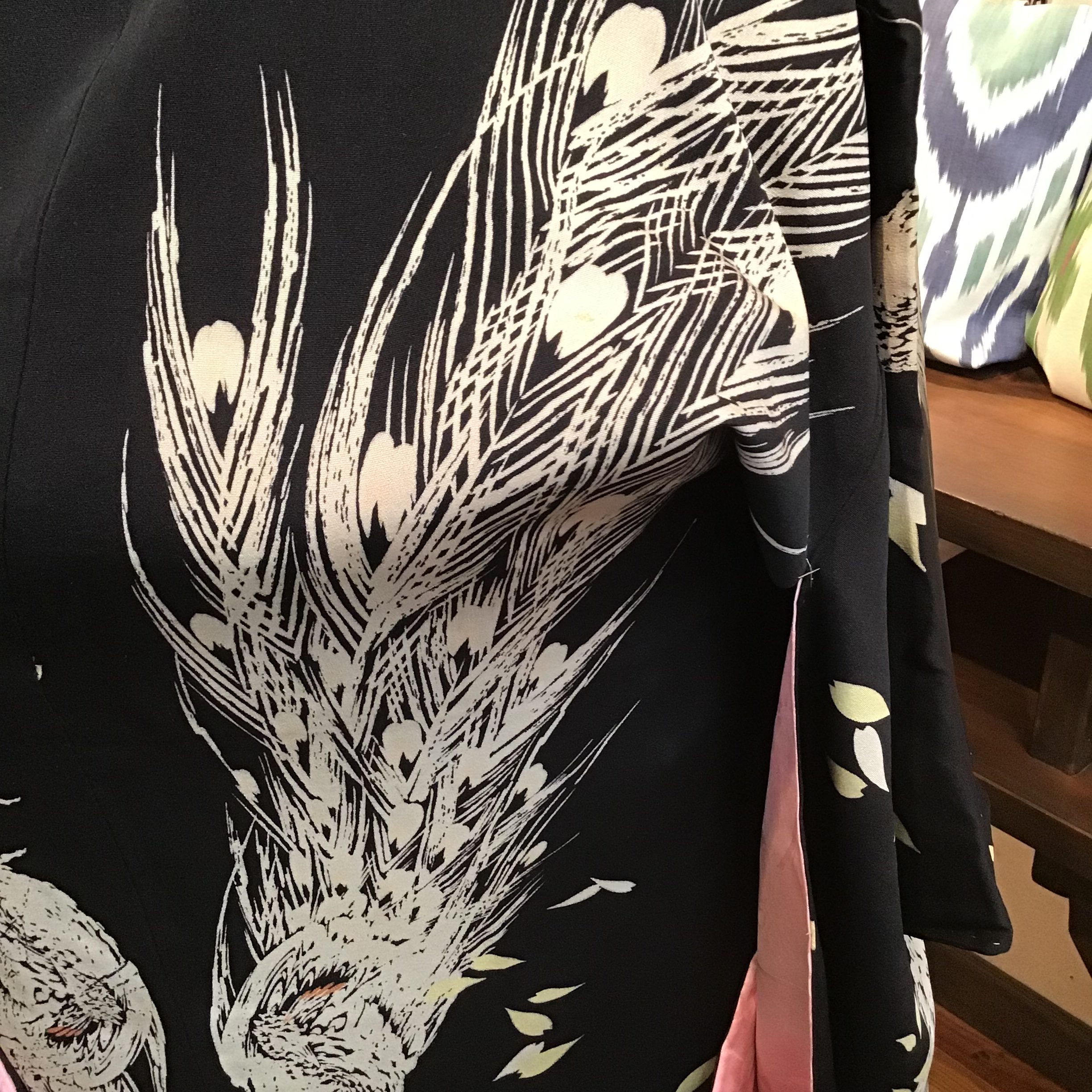 黒地に孔雀と桜の羽織 44,000円 裄1尺6寸5分、袖幅1尺5寸5分、袖丈1尺6寸、身丈2尺6寸、