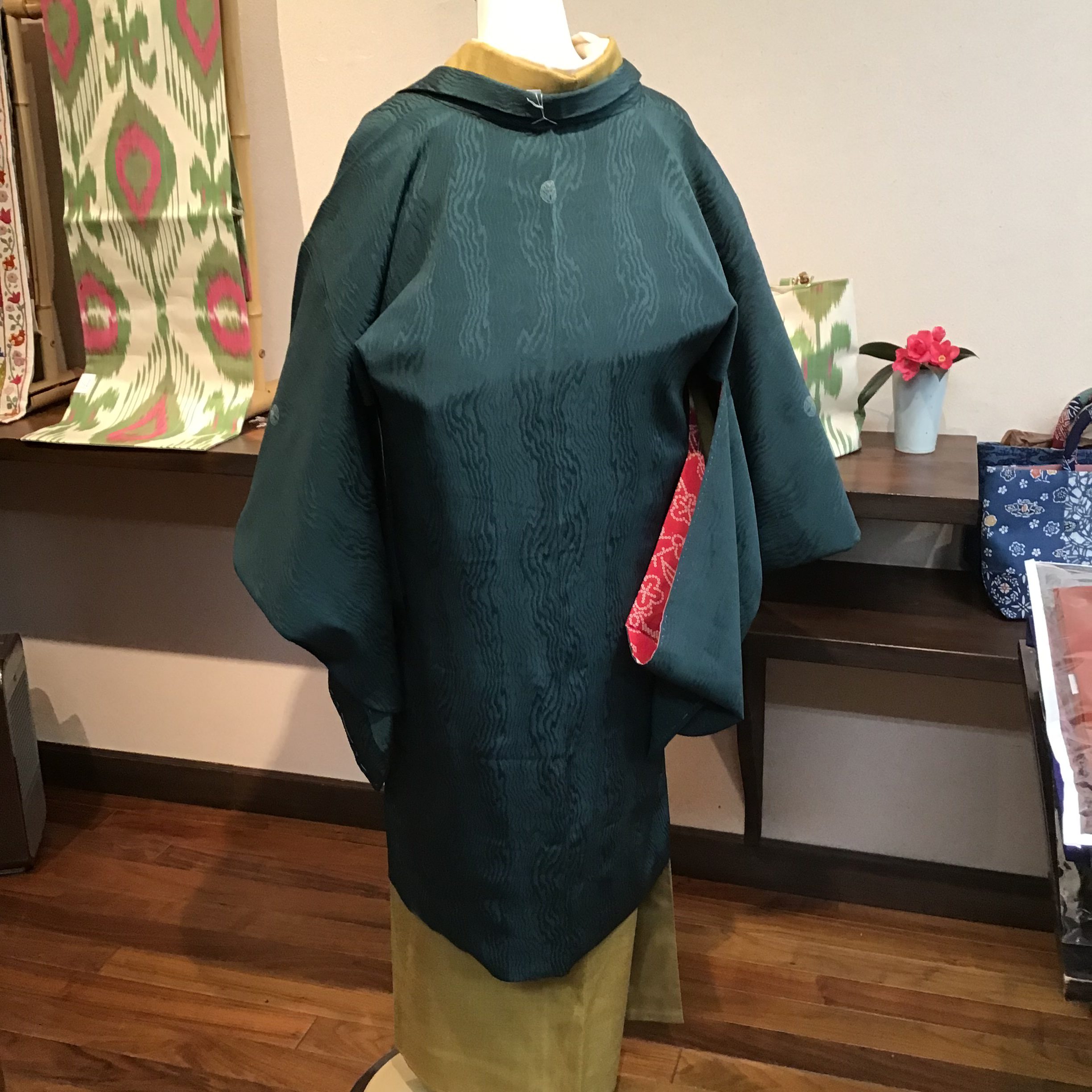 グリーンに地紋の羽織 44,000円 裄1尺7寸、袖幅1尺6寸2分、袖丈1尺6寸、1尺5寸5分、身丈2尺7寸