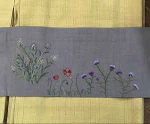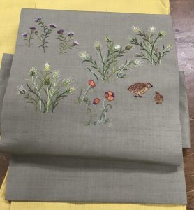 植物にウズラの親子が刺繍されていて、とてもかわいい。(22-05-25)