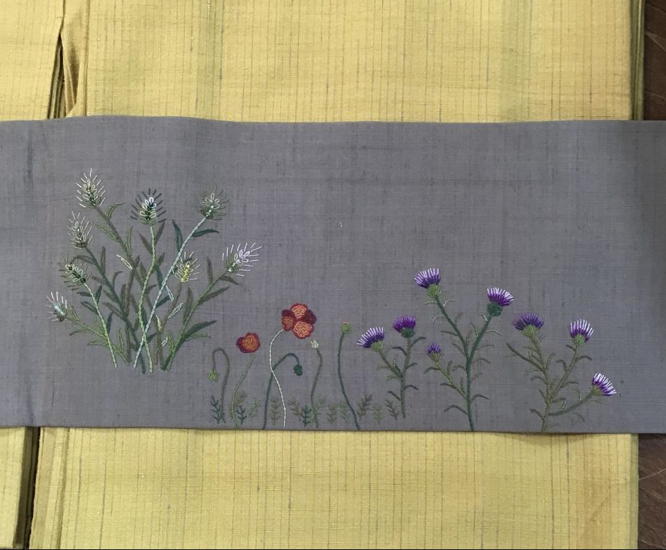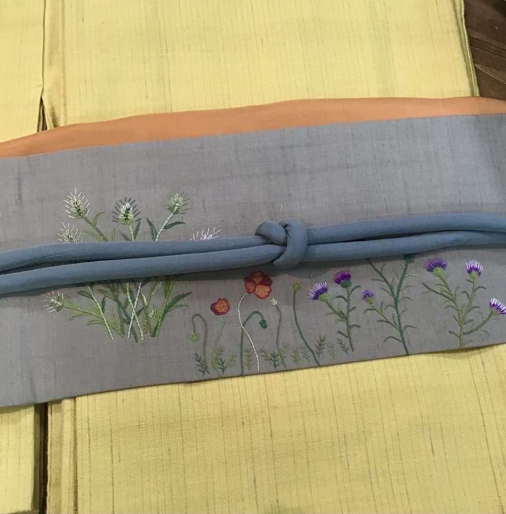 明るい色なので、シックな色合いの刺繍帯を合わせました。